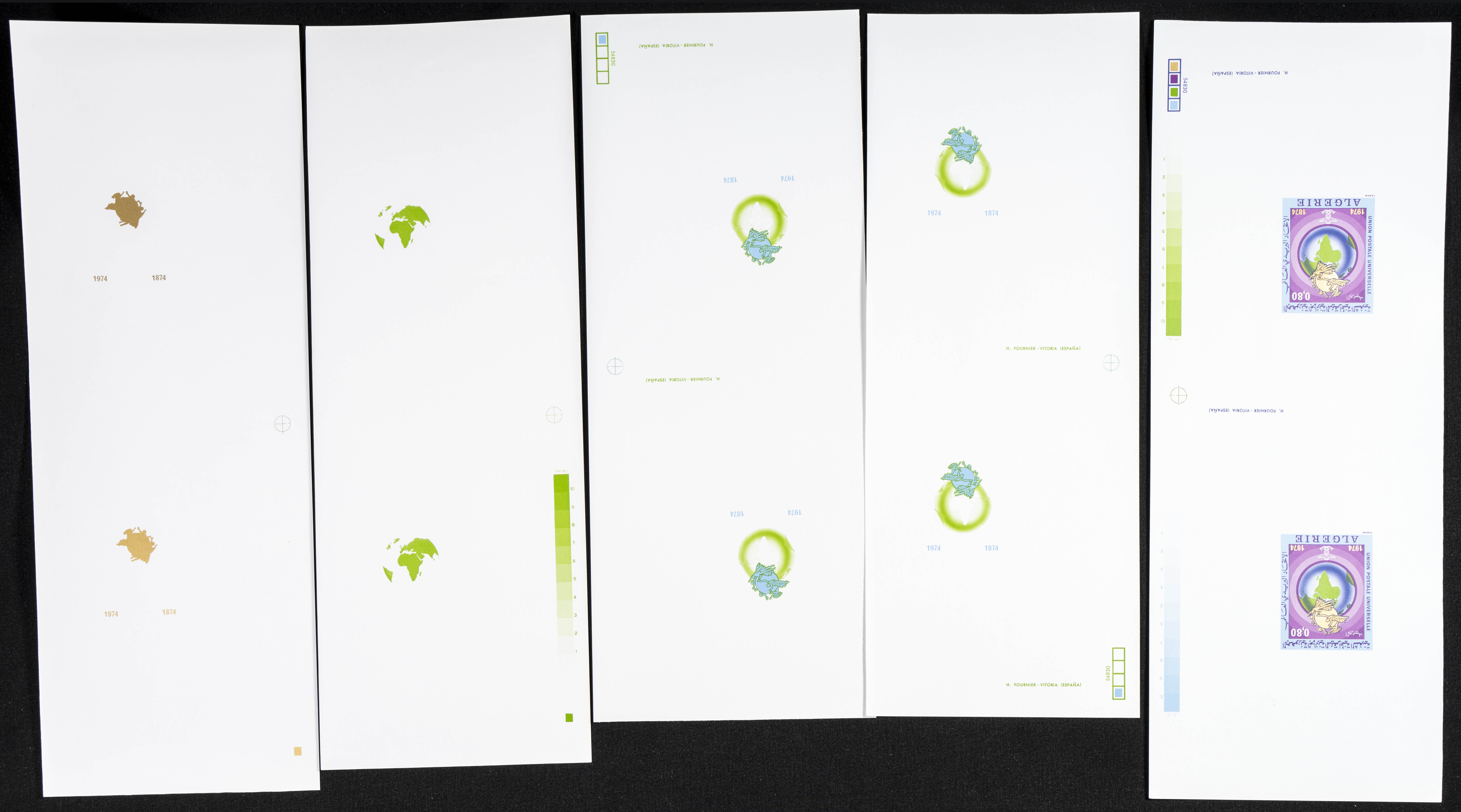 ★★Yvert 593. 1974. U.P.U.. Group of progressive plate proofs of the set. TO EXAM.
