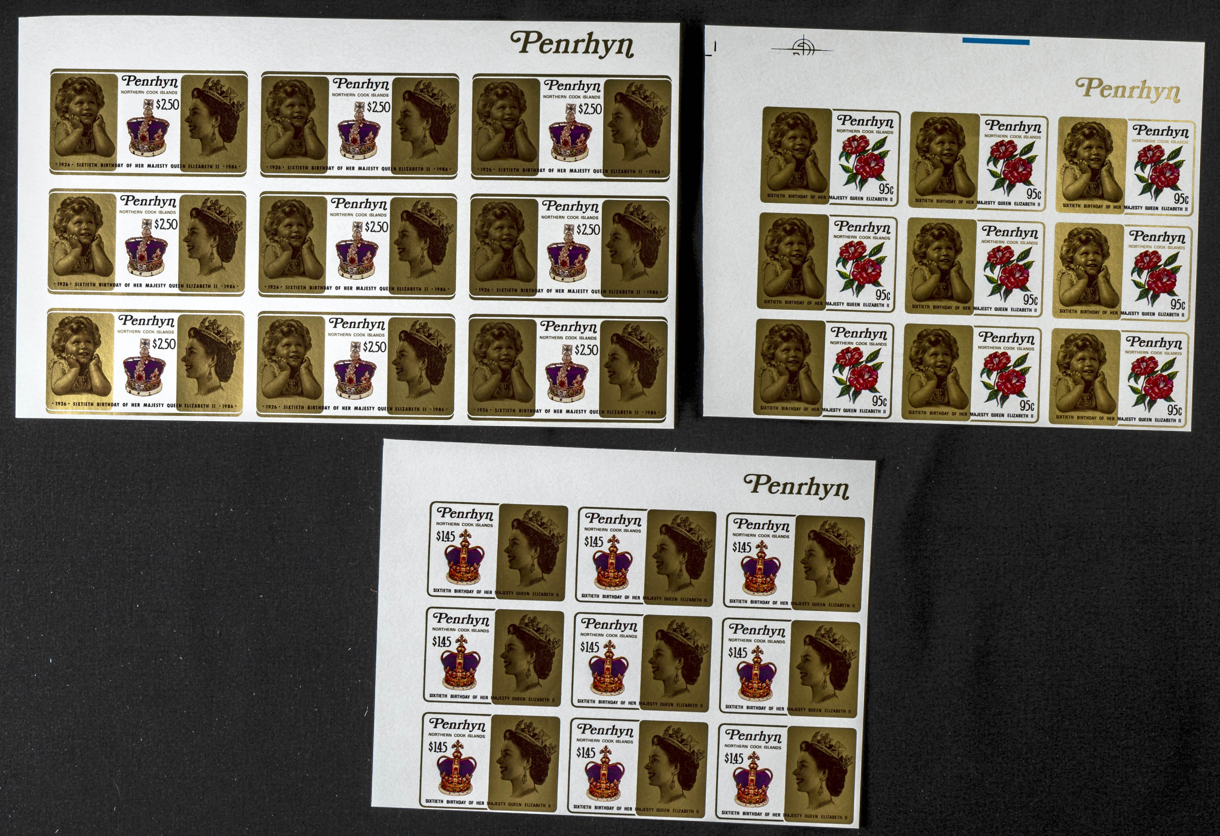★★Yvert 322/24. 1986. Elizabeth 60th birthday. Group of IMPERFORATED sets. TO EXAM.