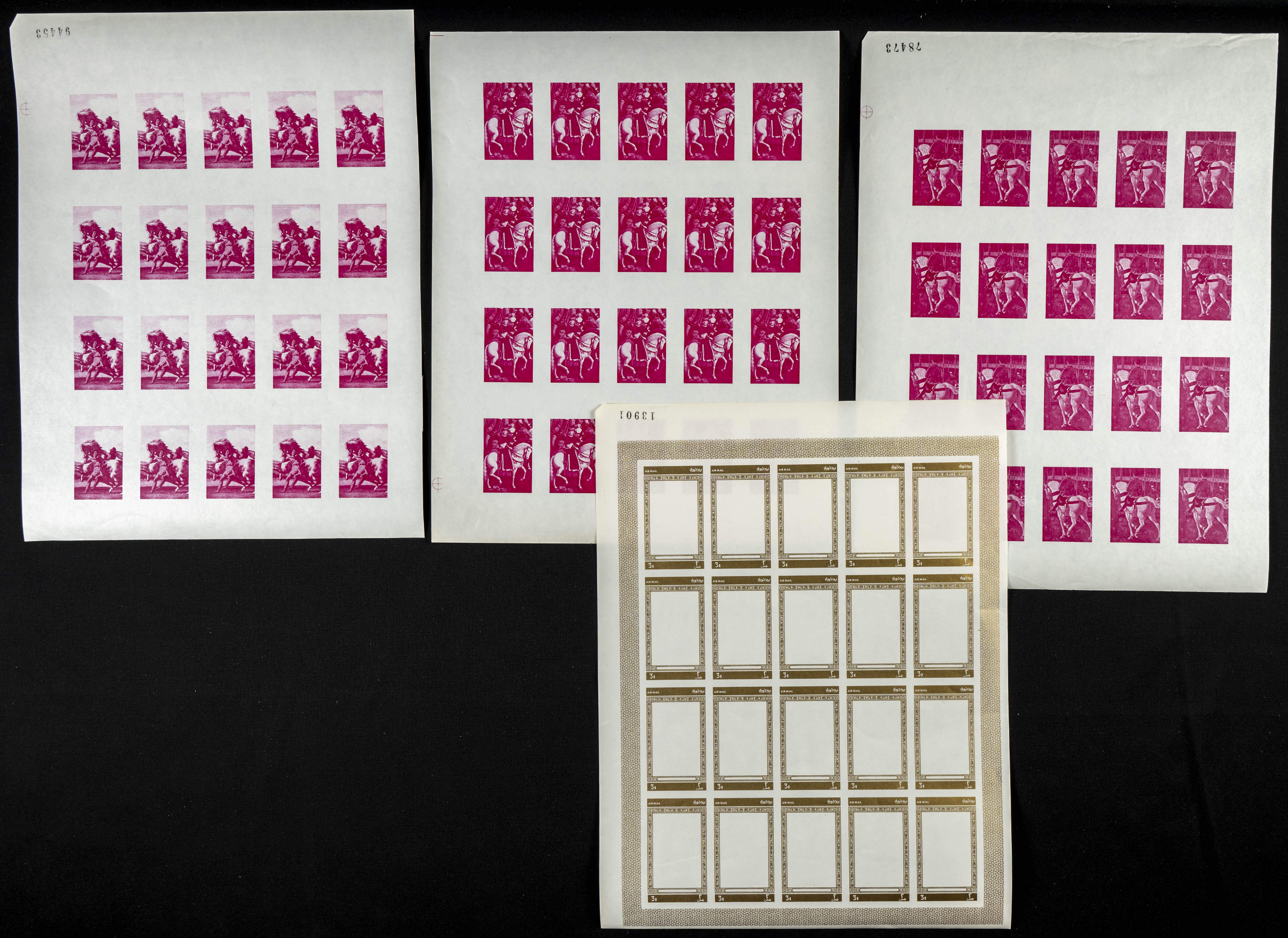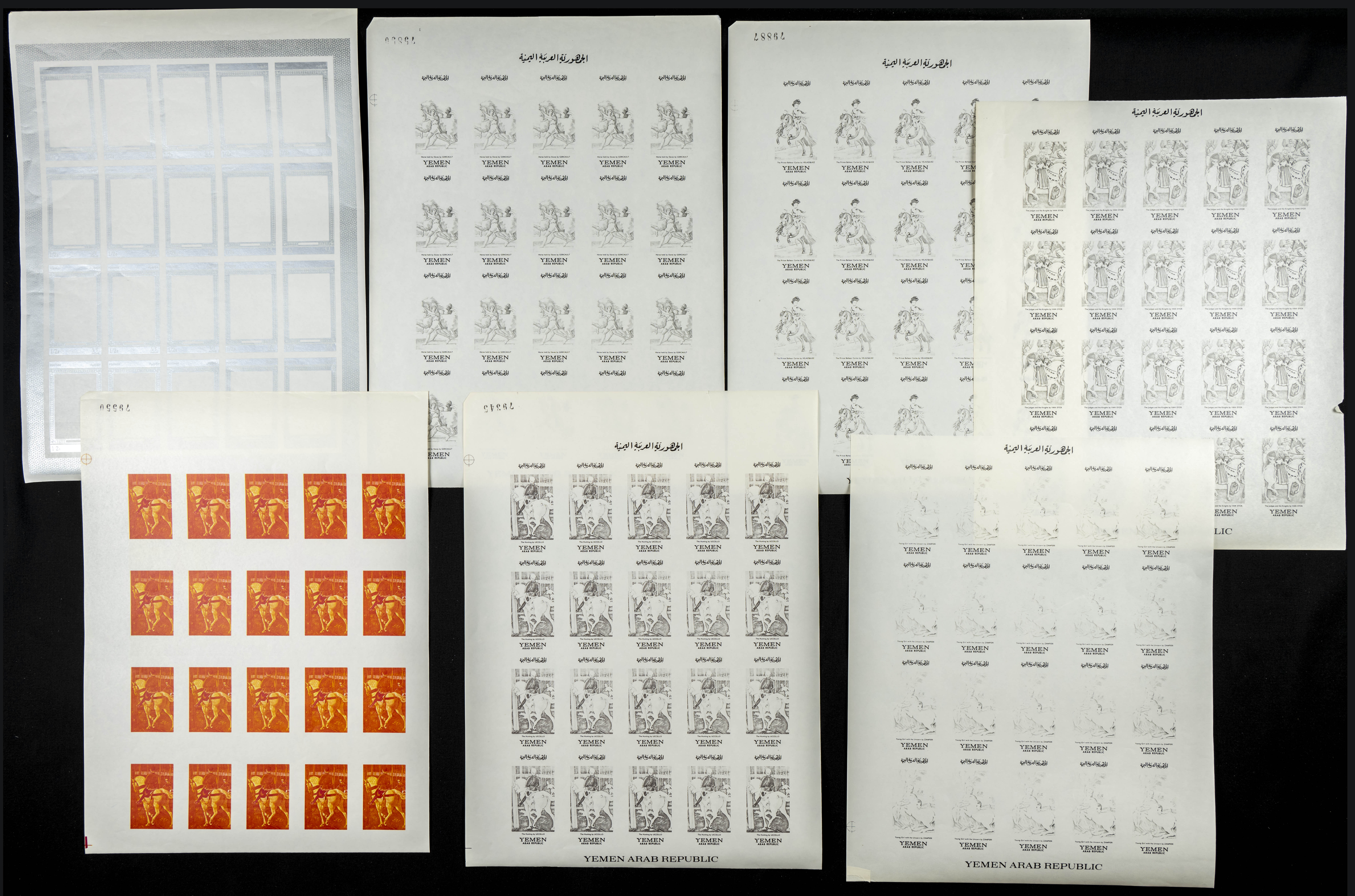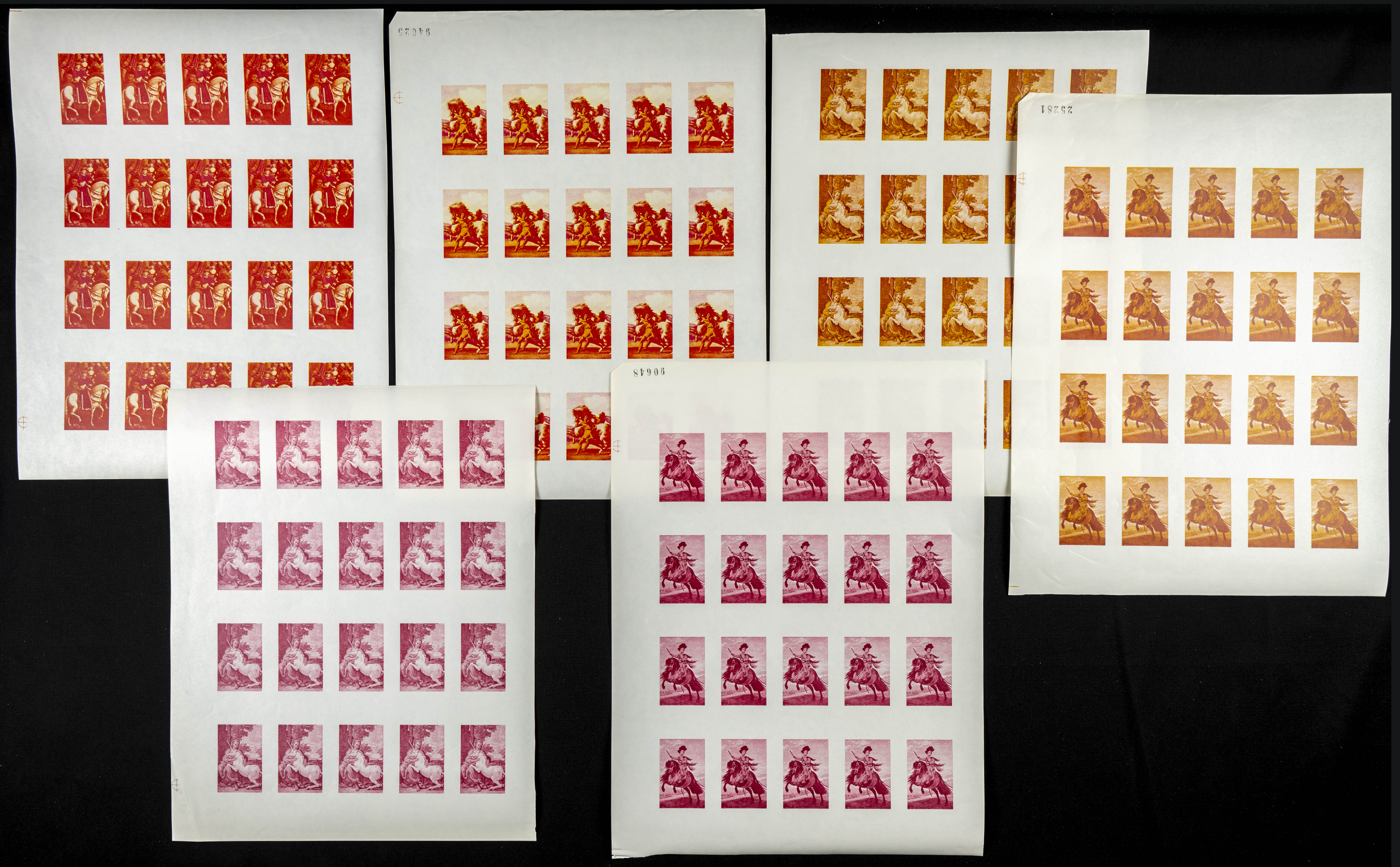 ★★1968. Horse paintings. Group of progressive plate proofs of the set. (Michel: 751/55). TO EXAM.