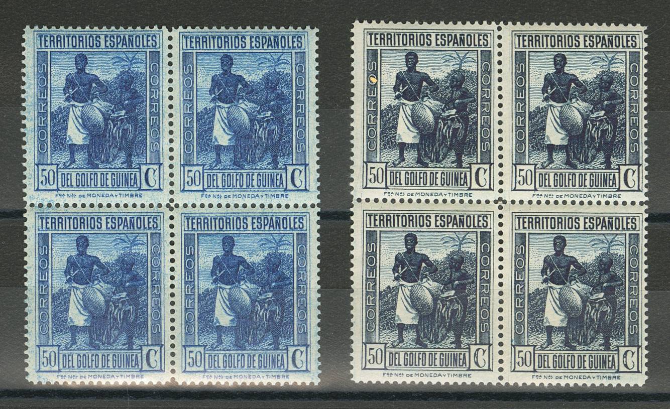 ★★ 250(4). 1934. 50 cts azul sobre azulado y 50 cts azul oscuro sobre blanco, bloques de cuatro. MAGNIFICOS Y RAROS, SOLO RESEÑADOS EN GALVEZ. (Gálvez 413, 413a)