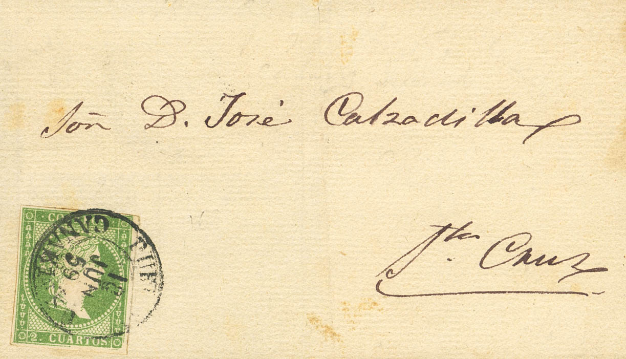 47. 1859. 2 cuartos verde. PUERTO DE OROTAVA a SANTA CRUZ DE TENERIFE. Matasello PUERTO DE O. / CANARIAS (Tipo I). MAGNIFICA Y RARA.