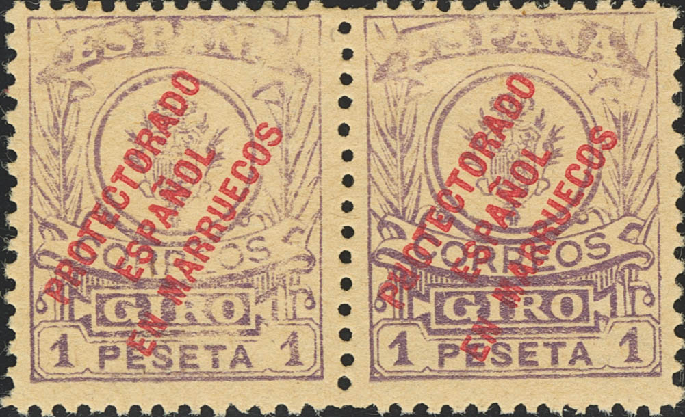 ★ 5, 5he. 1917. 1 pts violeta, pareja. Un sello "R" DE PROTECTORADO INVERTIDA. MAGNIFICA Y MUY RARA. Edifil 2018: ++287 Euros