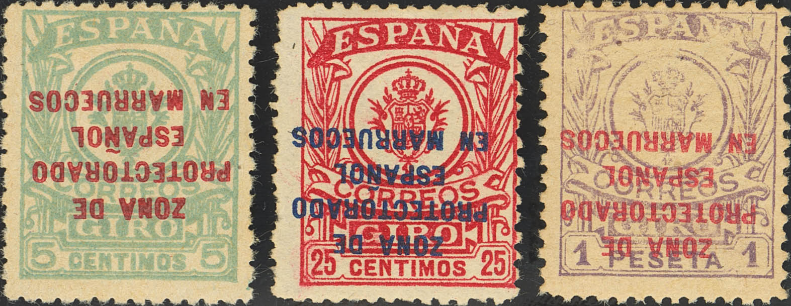 ★ 6hi, 8hi, 10hi. 1918. 5 cts azul, 25 cts carmín y 1 pts violeta. SOBRECARGA INVERTIDA. MAGNIFICOS Y RAROS, EL 25 CTS NO ESTA RESEÑADO.