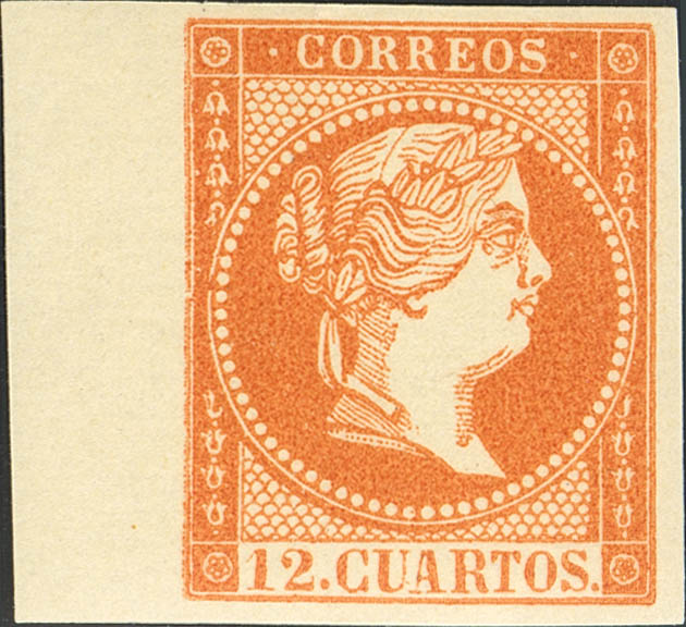 ★★ NE1A. 1855. 12 cuartos naranja NO EMITIDO, borde de hoja. 2ª TIRADA. MAGNIFICO.