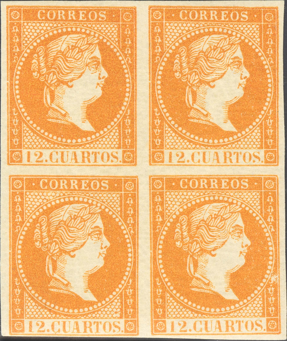 ★ NE1(4). 1855. 12 cuartos naranja NO EMITIDO, bloque de cuatro. 2ª Tirada. MAGNIFICO. Edifil 2020: 775 Euros