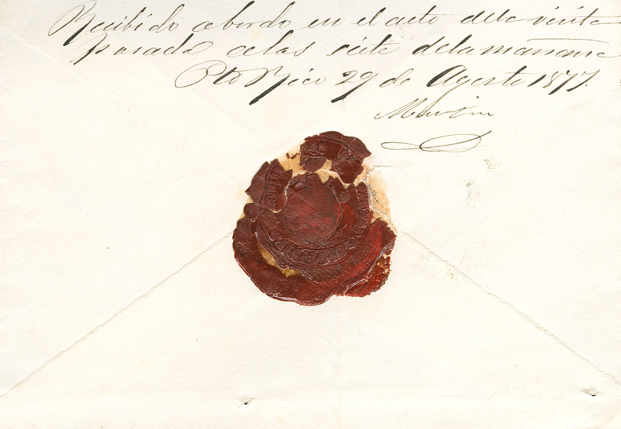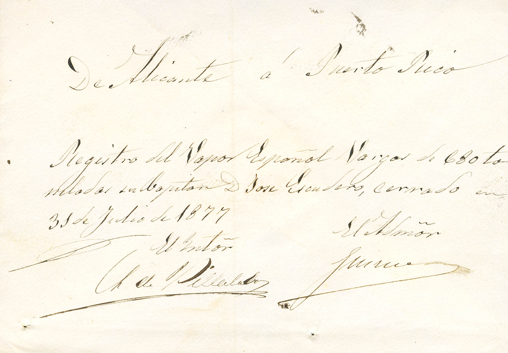 1877. Registro de Embarque del "Vapor Español Vargas" de ALICANTE a PUERTO RICO. Recibí del Capitán. MAGNIFICO.