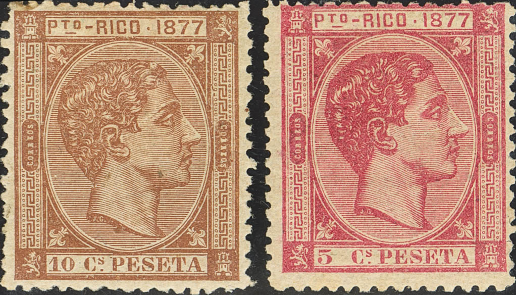 ★ 13ec, 14ec. 1877. 5 cts carmín y 10 cts castaño. ERRORES DE COLOR. MAGNIFICOS Y RARISIMOS.