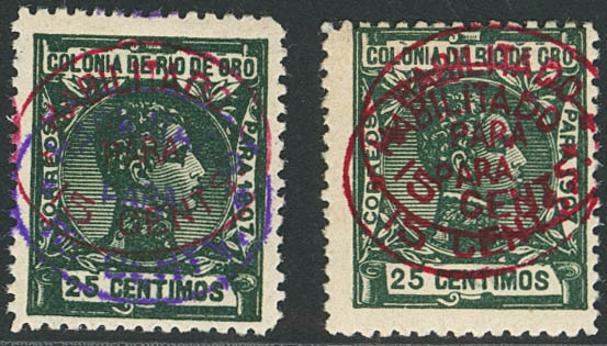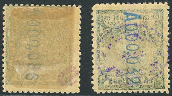 ★ 38hh, 38hhca. 1908. 15 cts sobre 25 cts verde, dos sellos. SOBRECARGA DOBLE, uno en carmín y otro en carmín y violeta. MAGNIFICOS.