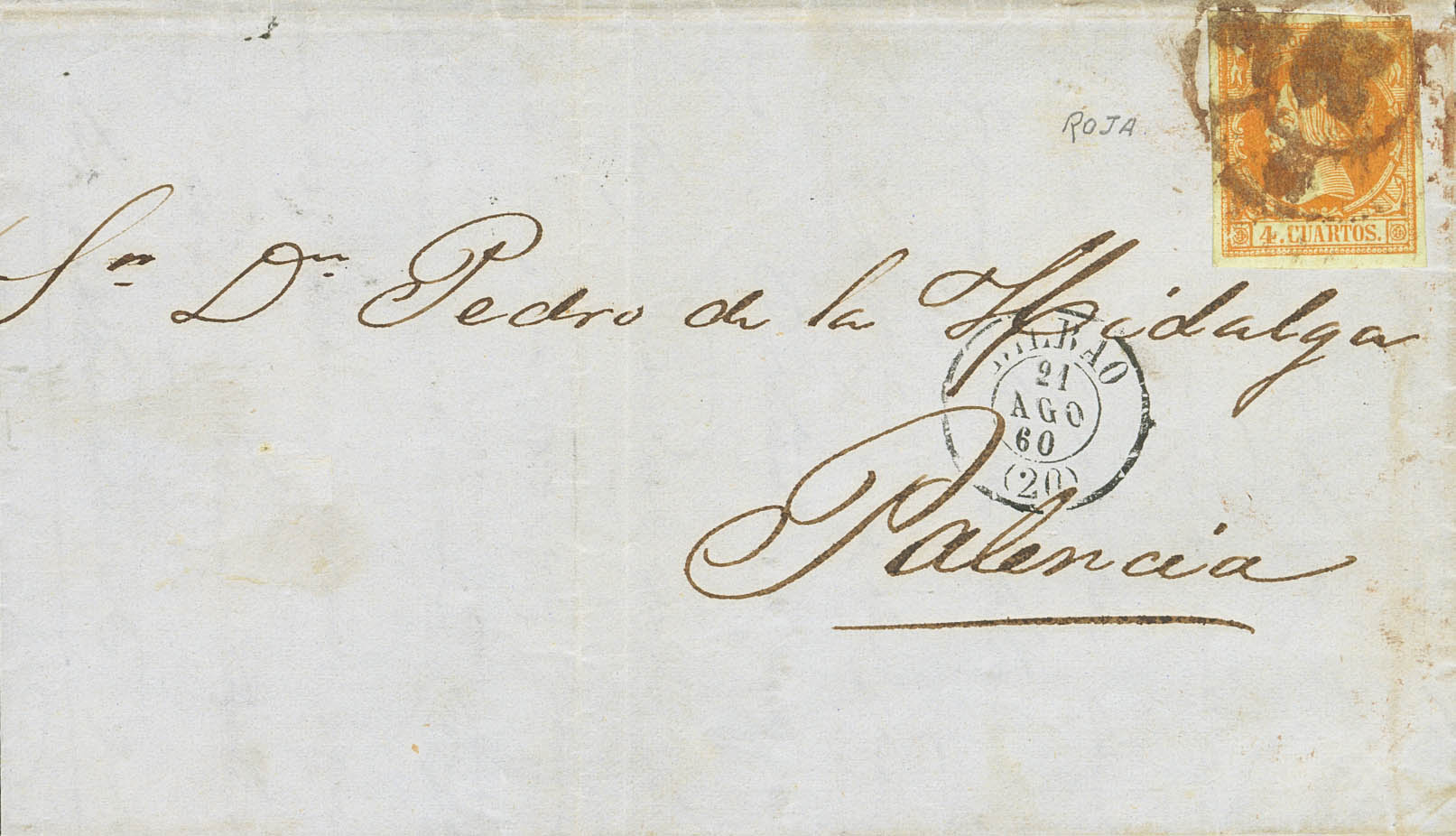 52. 1860. 4 cuartos naranja. BILBAO a PALENCIA. Matasello R.CARRETA Nº20, de Bilbao. MAGNIFICA Y RARISIMA EN ESTA ESPECTACULAR CALIDAD, SIN DUDA UNA DE LAS MEJORES CONOCIDAS.