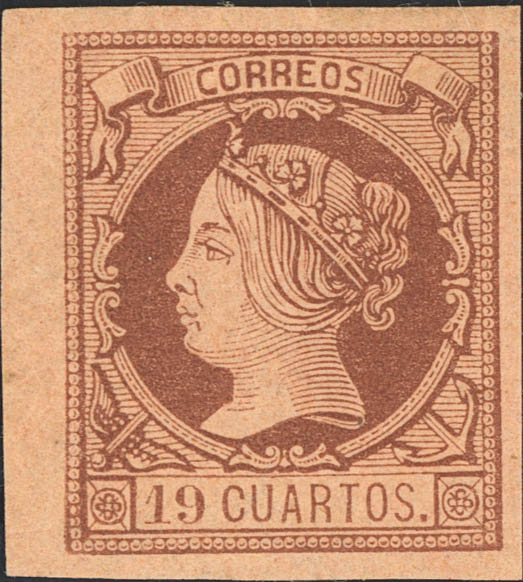 (★) 54M. 1860. 19 cuartos castaño, borde de hoja (inapreciable raya de tinta lavada). Color muy intenso. MAGNIFICO Y ESPECTACULAR PRESENCIA. Cert. COMEX.