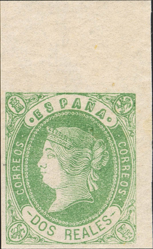 ★★ 62. 1862. 2 reales verde, esquina de pliego. PIEZA DE LUJO.