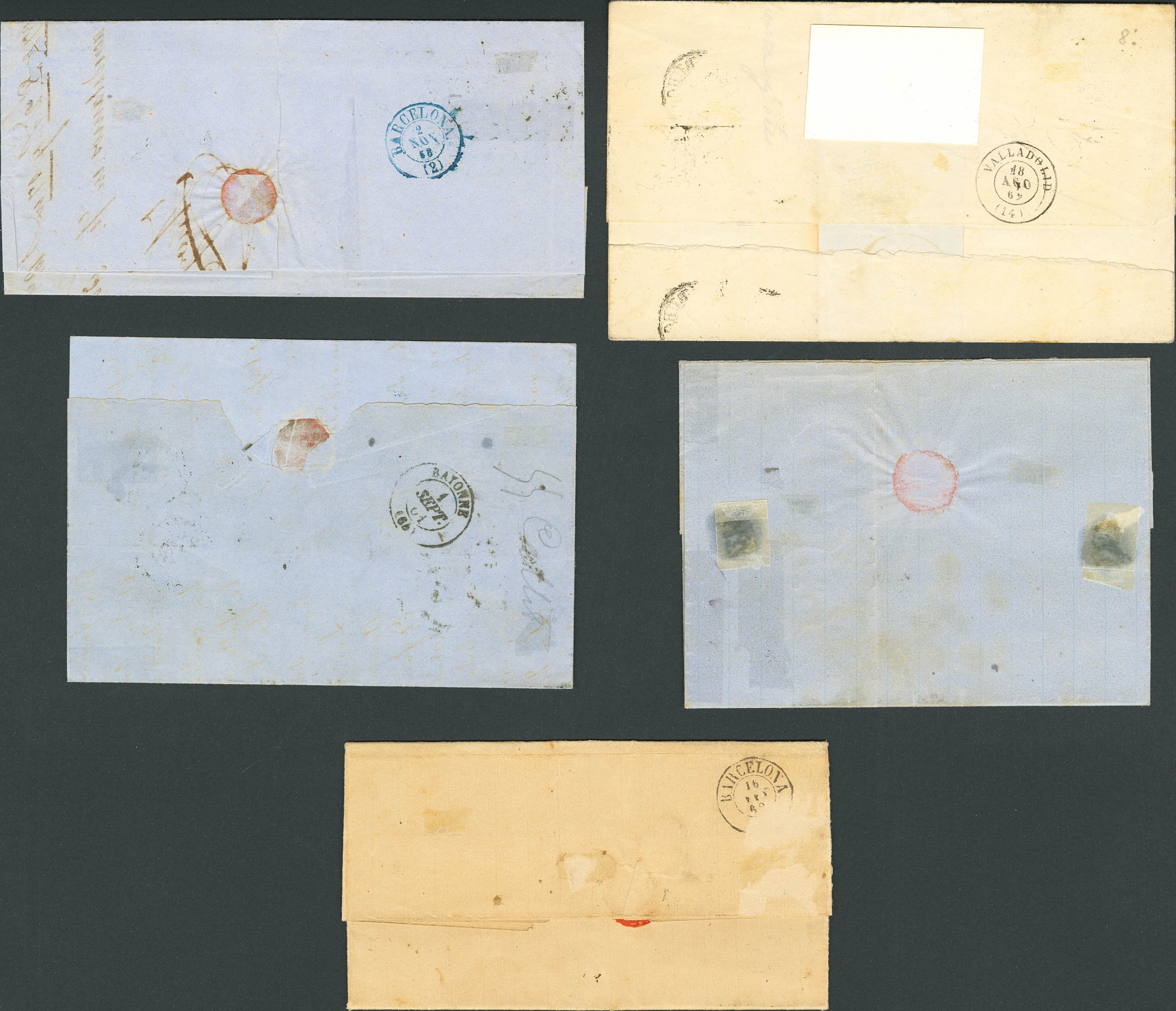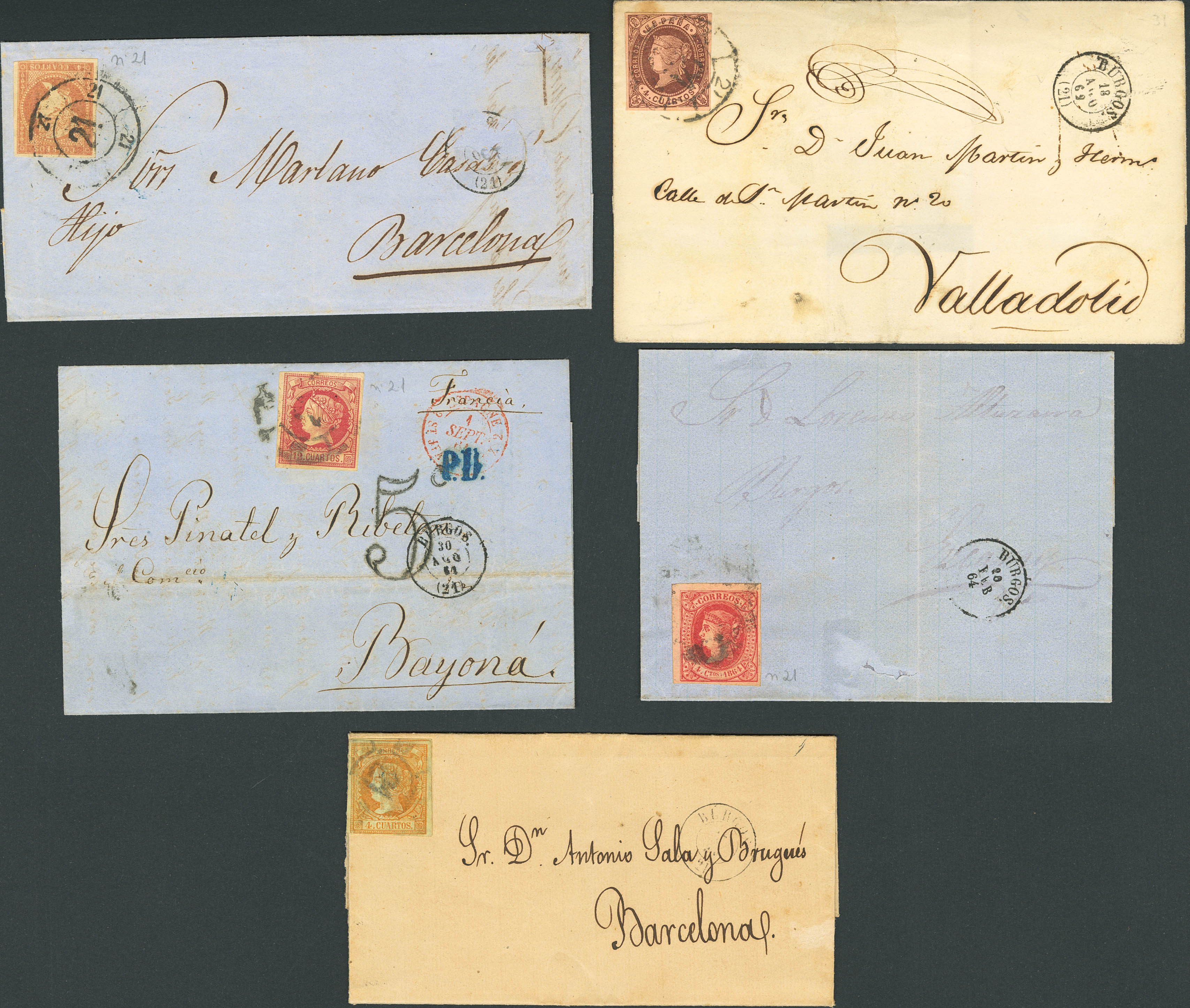 (1859ca). Conjunto de cinco cartas, una de ellas dirigidas a Francia, franqueadas con sellos de las emisiones de Isabel II sin dentar con matasello R.CARRETA Nº21, de Burgos. A EXAMINAR.