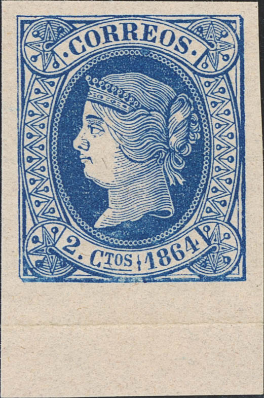 (★) 63. 1864. 2 cuartos azul, borde de hoja. Color intenso. PIEZA DE LUJO.