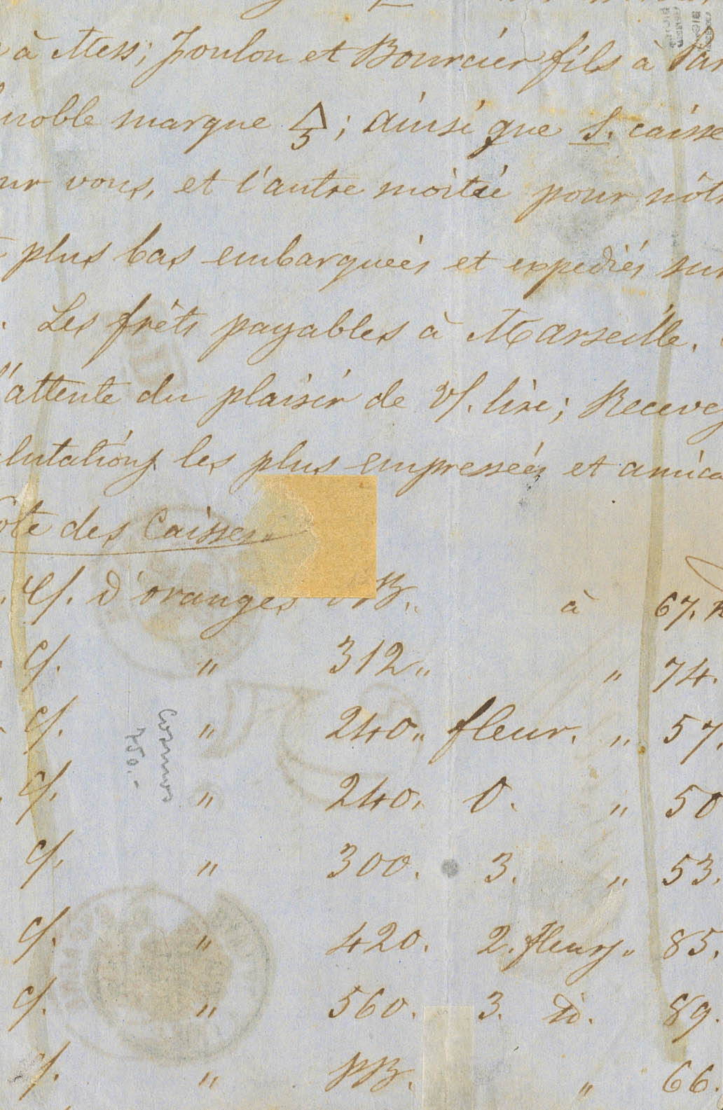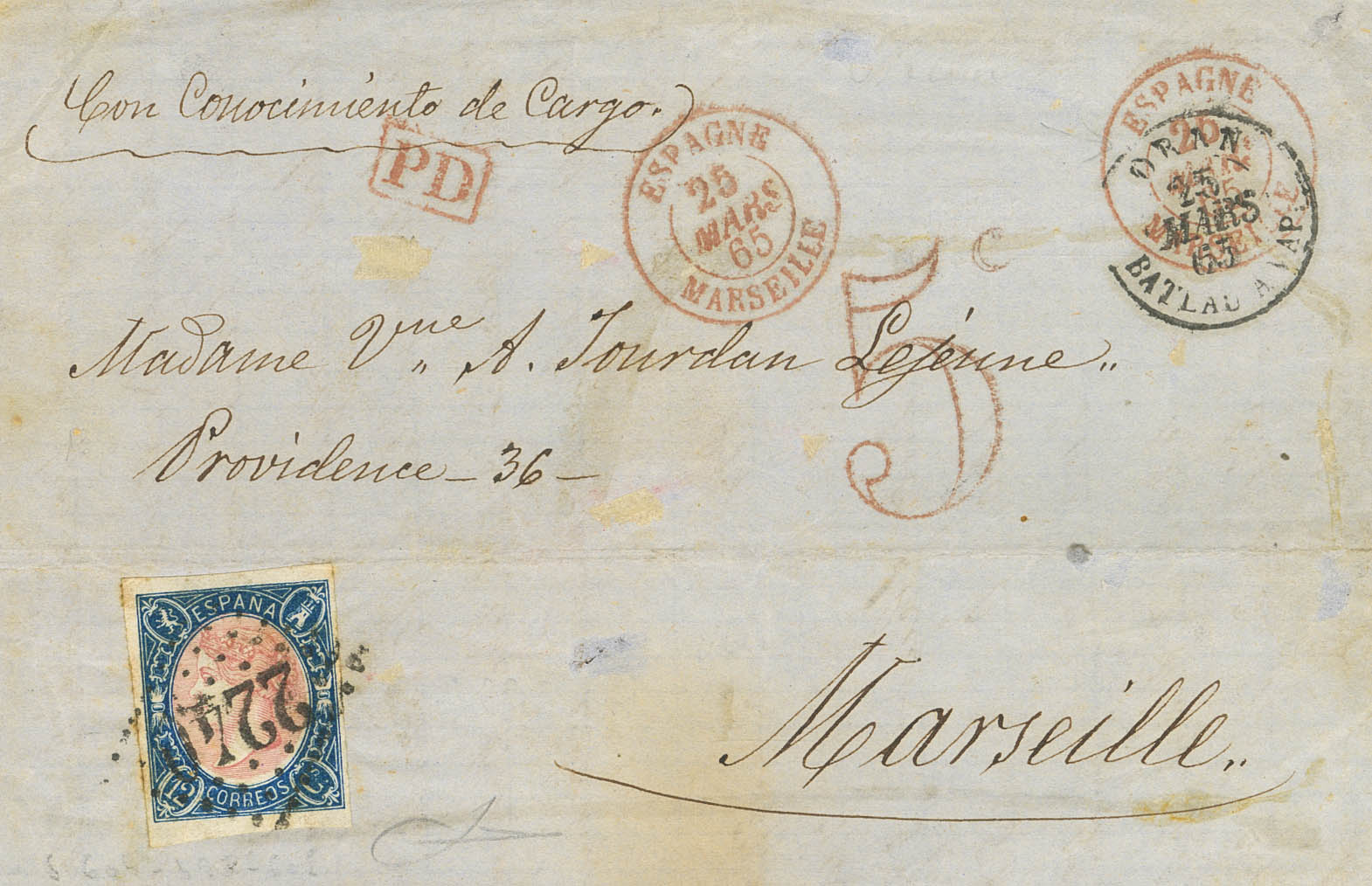 70. 1865. 12 cuartos azul y rosa. Frontal dirigido a MARSELLA. Matasello francés Rombo de cifras grandes "2240", aplicado a la llegada y en el frente fechador ORAN / BATEAU A VAP. y manuscrito "Con conocimiento de cargo". MAGNIFICA E INUSUAL.