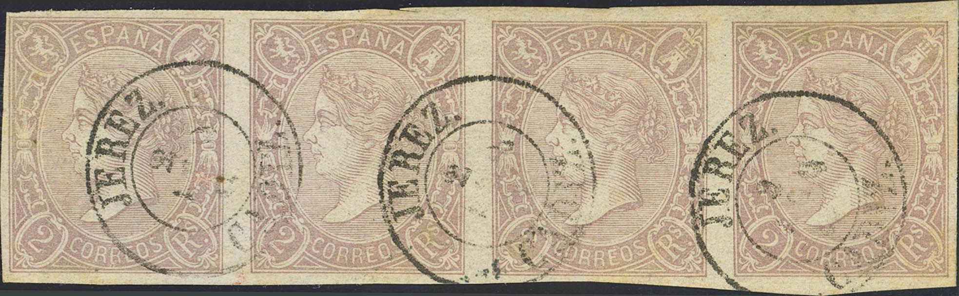 73(4). 1865. 2 reales lila gris, tira de cuatro. Matasello JEREZ / CADIZ. MAGNIFICA.