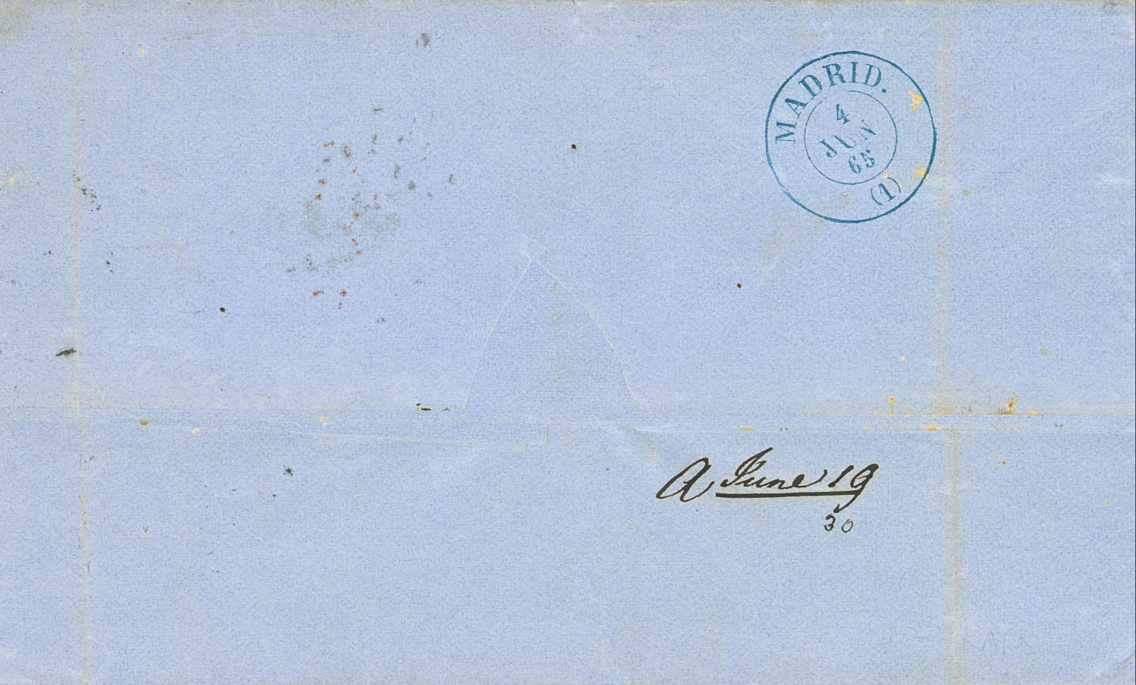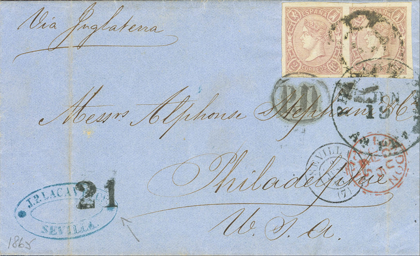 73(2). 1865. 2 reales lila, pareja. SEVILLA a FILADELFIA (U.S.A.), circulada vía Inglaterra. MAGNIFICA Y RARO FRANQUEO DE PORTE SIMPLE.