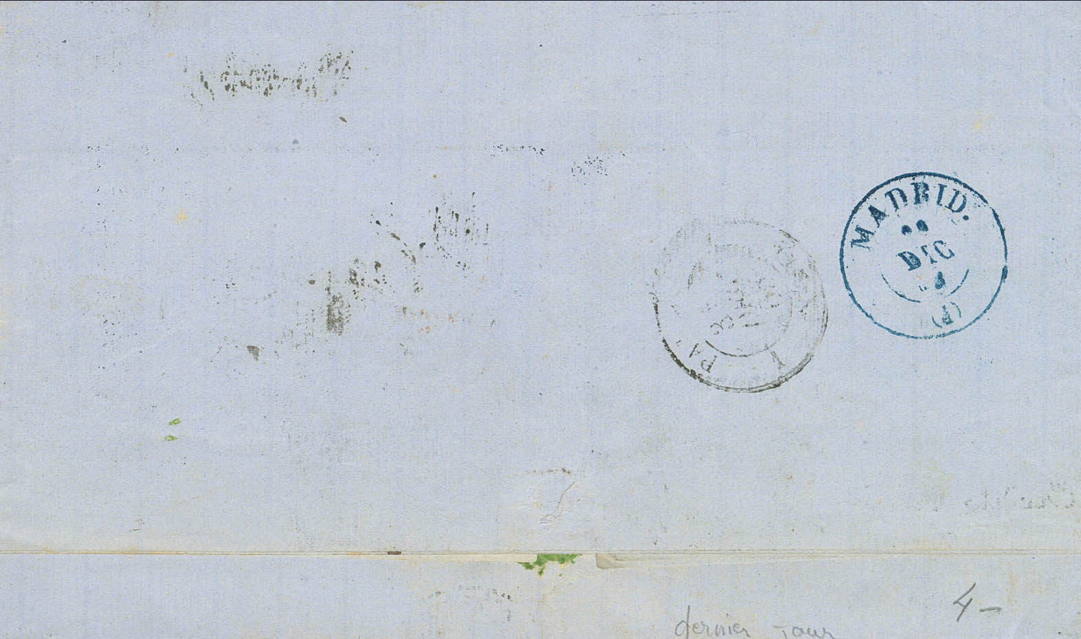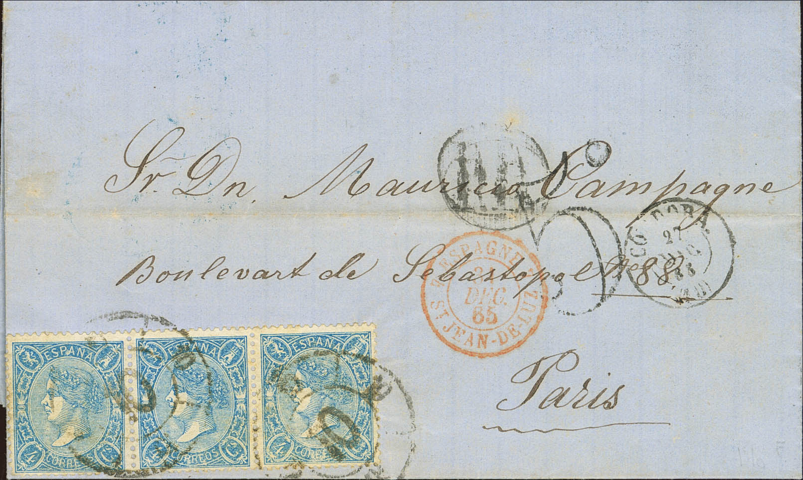 75(3). 1865. 4 cuartos azul, tira de tres. CORDOBA a PARIS. Matasello R.CARRETA Nº10, de Córdoba. MAGNIFICA.