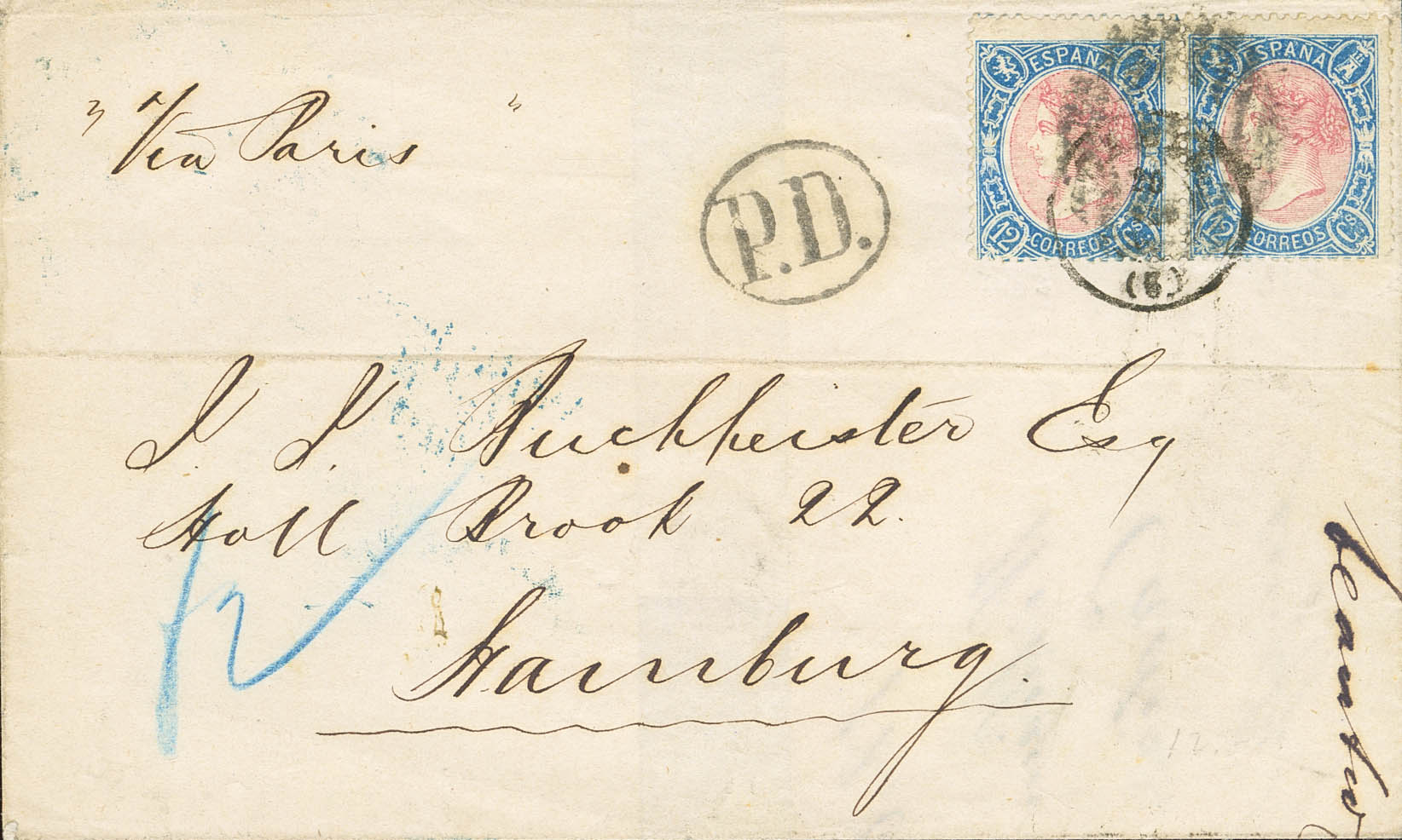 76(2). 1865. 12 cuartos azul y rosa, pareja. CADIZ a HAMBURGO (ALEMANIA). MAGNIFICA Y RARA TARIFA DE 24 CUARTOS A PRUSIA.