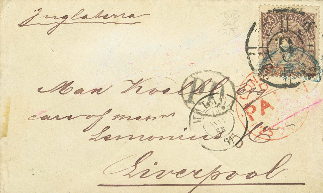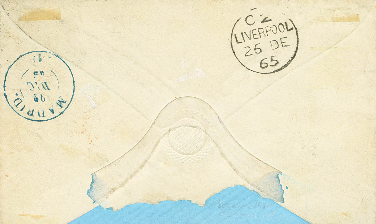 79. 1865. 2 reales lila oscuro. MALAGA a LIVERPOOL (GRAN BRETAÑA). MAGNIFICA Y RARA.