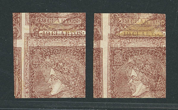 (★) 80P(2). 1866. 2 cuartos rosa, dos sellos. ENSAYO DE COLOR sin dentar (impresión del 19 cuartos al dorso). MAGNIFICO. (Gálvez 348M)