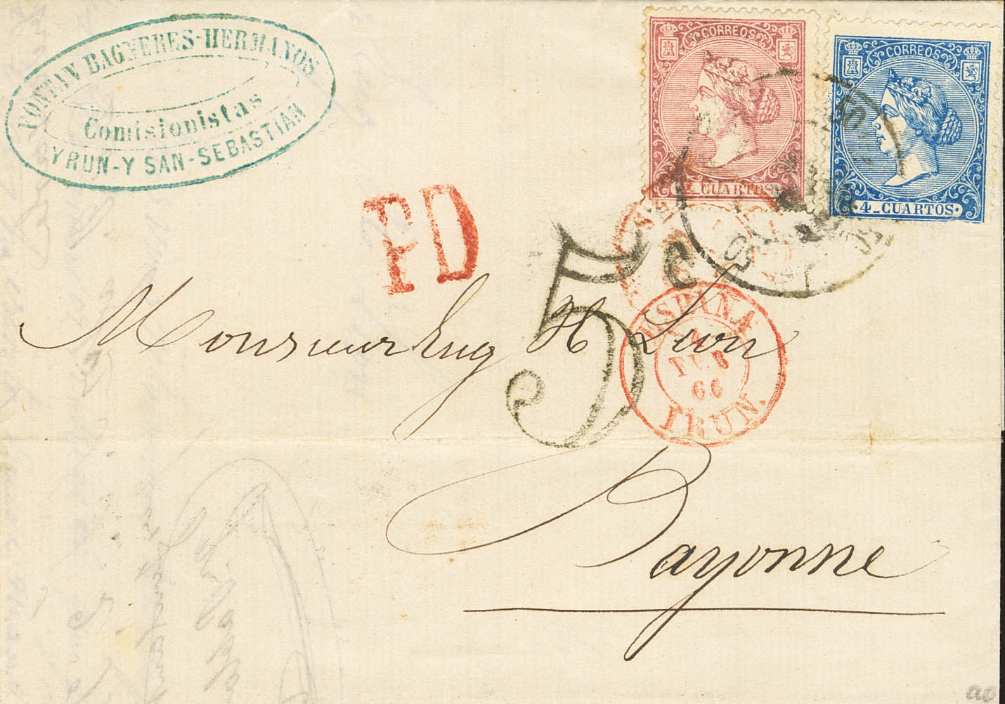 80, 81. 1866. 2 cuartos rosa y 4 cuartos azul. IRUN a BAYONA. MAGNIFICA Y RARO FRANQUEO FRONTERIZO A FRANCIA.