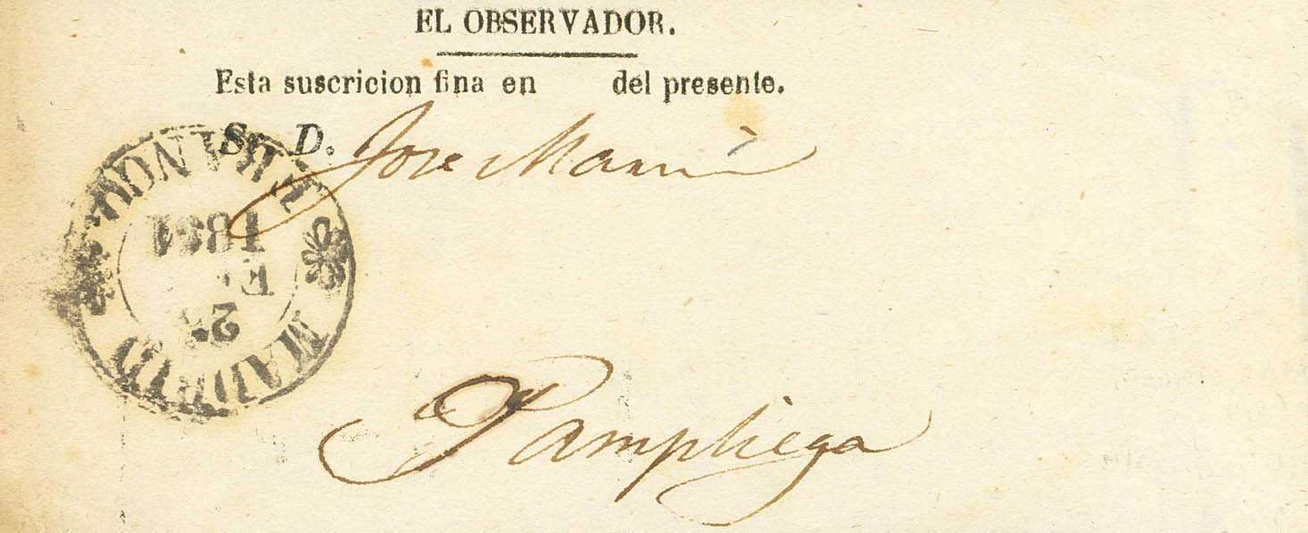 1851. Faja de Periódico EL OBSERVADOR de MADRID a PAMPLIEGA. Marca MADRID / FRANCO, en negro (P.E.30) edición 2004. MAGNIFICA Y MUY RARA.