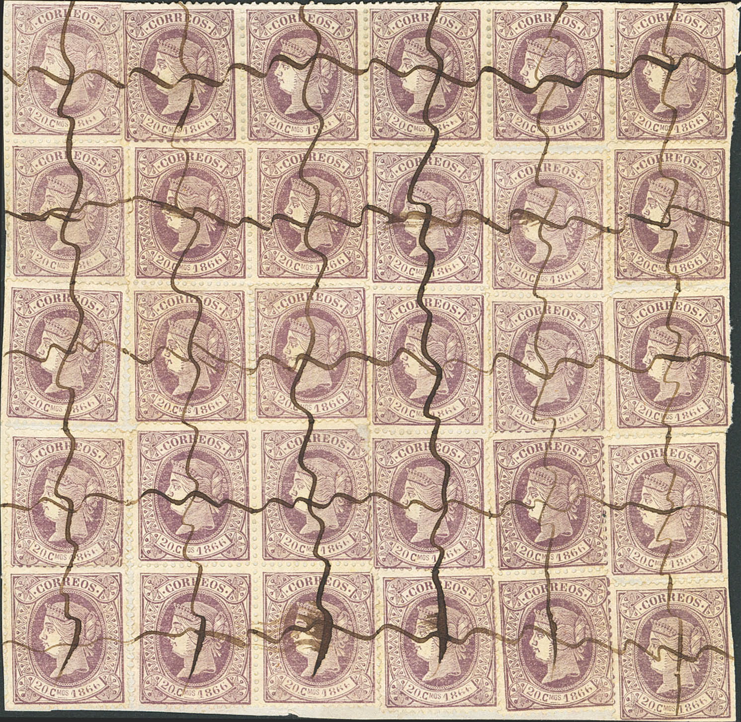 86(30). 1866. 20 cts lila, treinta sellos, sobre fragmento (algún pequeño defecto propio de bloques de este tamaño). MAGNIFICO Y RARISIMO, MUY PROBABLEMENTE EL MAYOR BLOQUE CONOCIDO, AUNQUE SEA COMPUESTO POR BLOQUES MAS PEQUEÑOS. Edifil 2020: +3.600 Euros