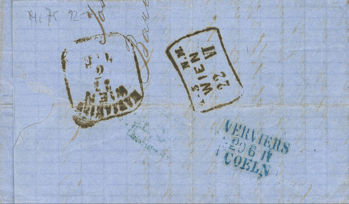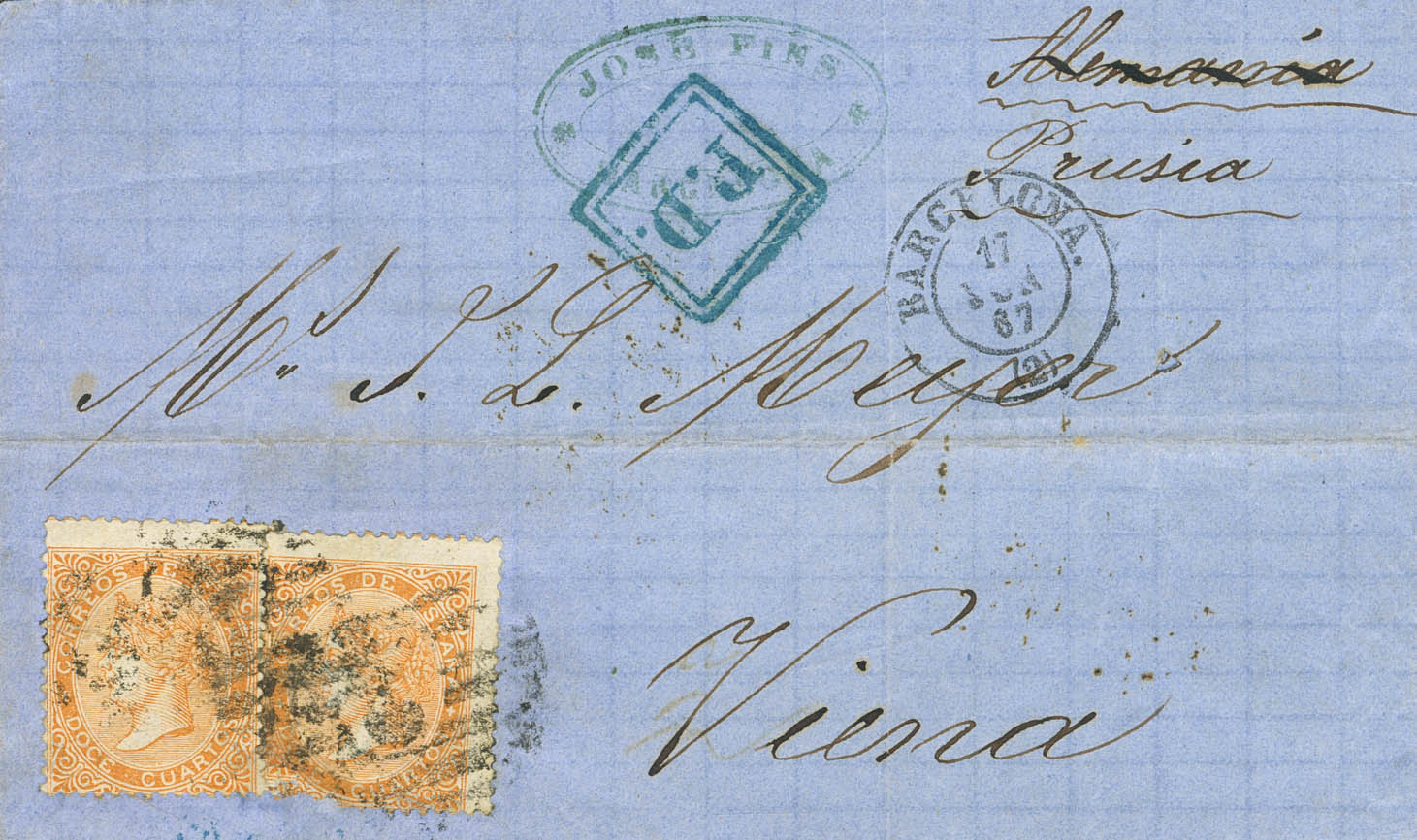 89(2). 1867. 12 cuartos naranja. BARCELONA a VIENA (AUSTRIA-HUNGRIA), en este momento se estaba creando el Imperio Austrohúngaro pero Austria pertenecía a Prusia por lo que la tarifa corresponde al Convenio con Prusia y Estados de la Unión Alemana, en vigor desde Julio de 1864 cuyo porte sencillo eran 24 cuartos. Al dorso tránsitos y llegada. BONITA Y RARA.