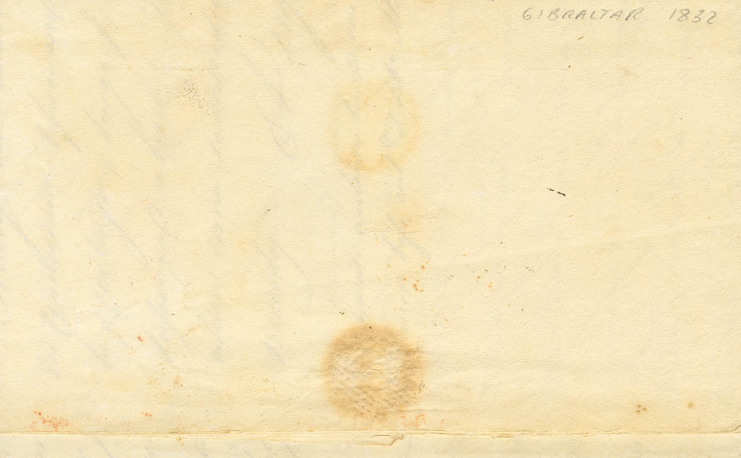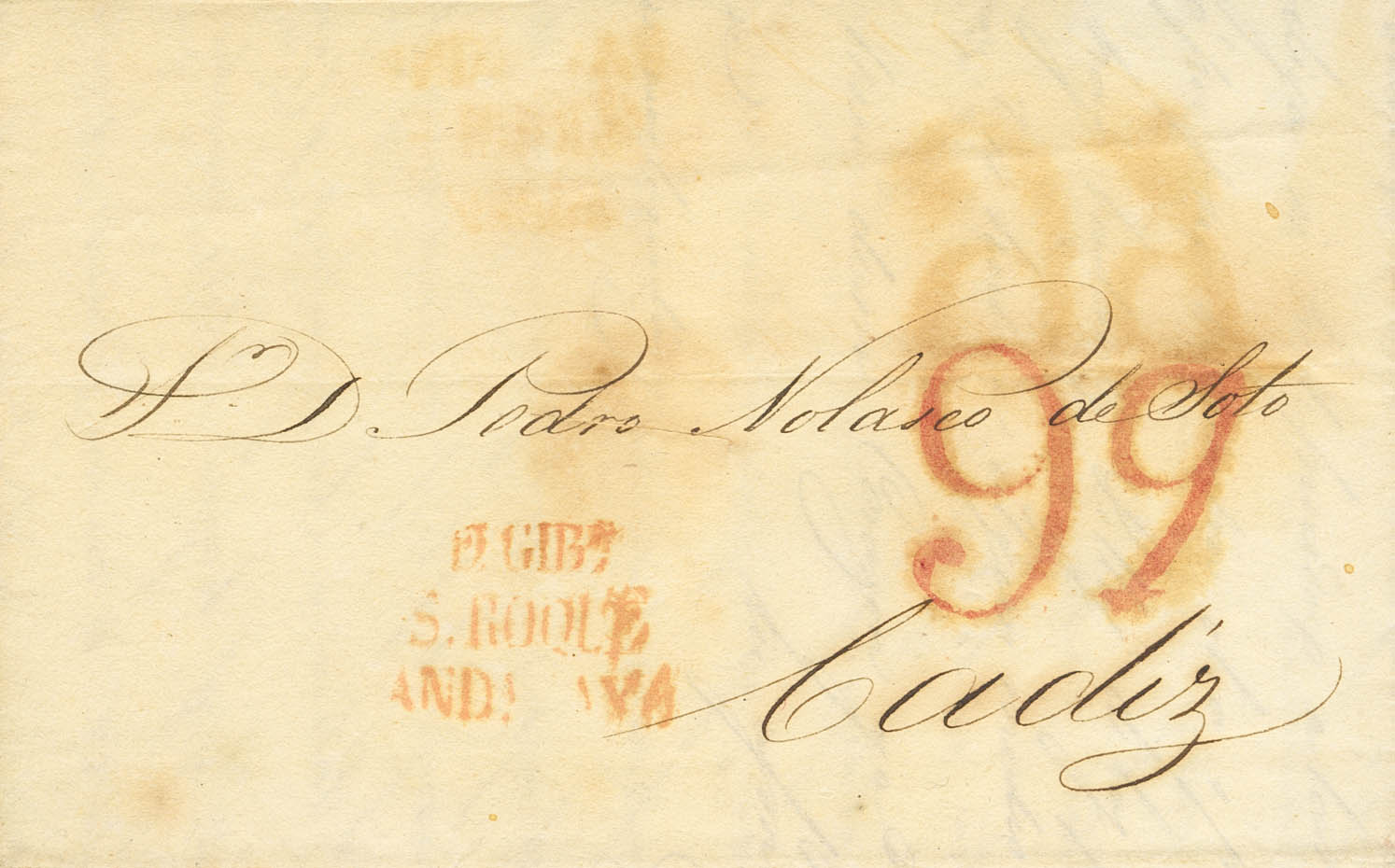 1832. GIBRALTAR a CADIZ. Marca de GIBR. / S. ROQUE / ANDA. BAXA, en rojo (P.E.10) edición 2004. MAGNIFICA.