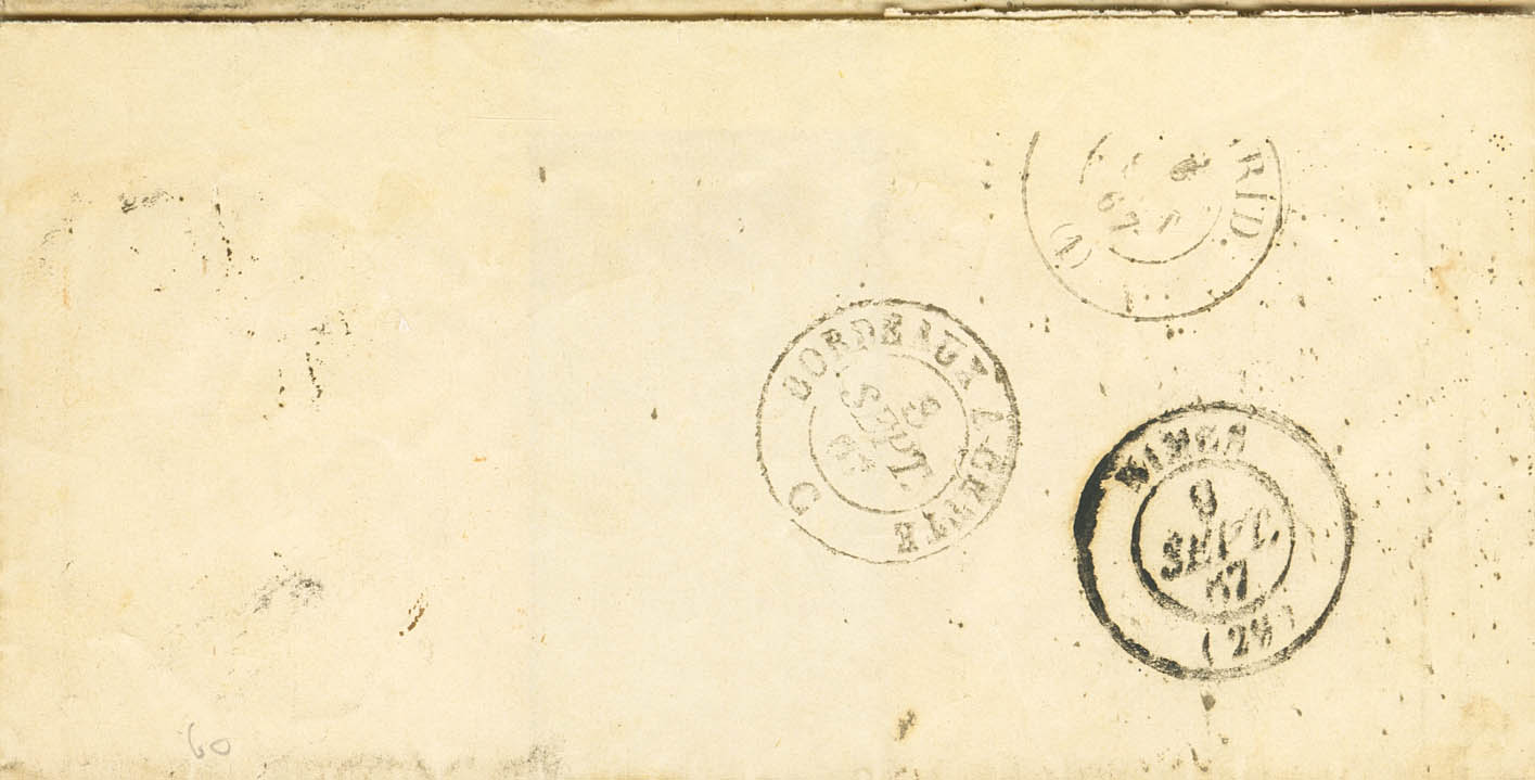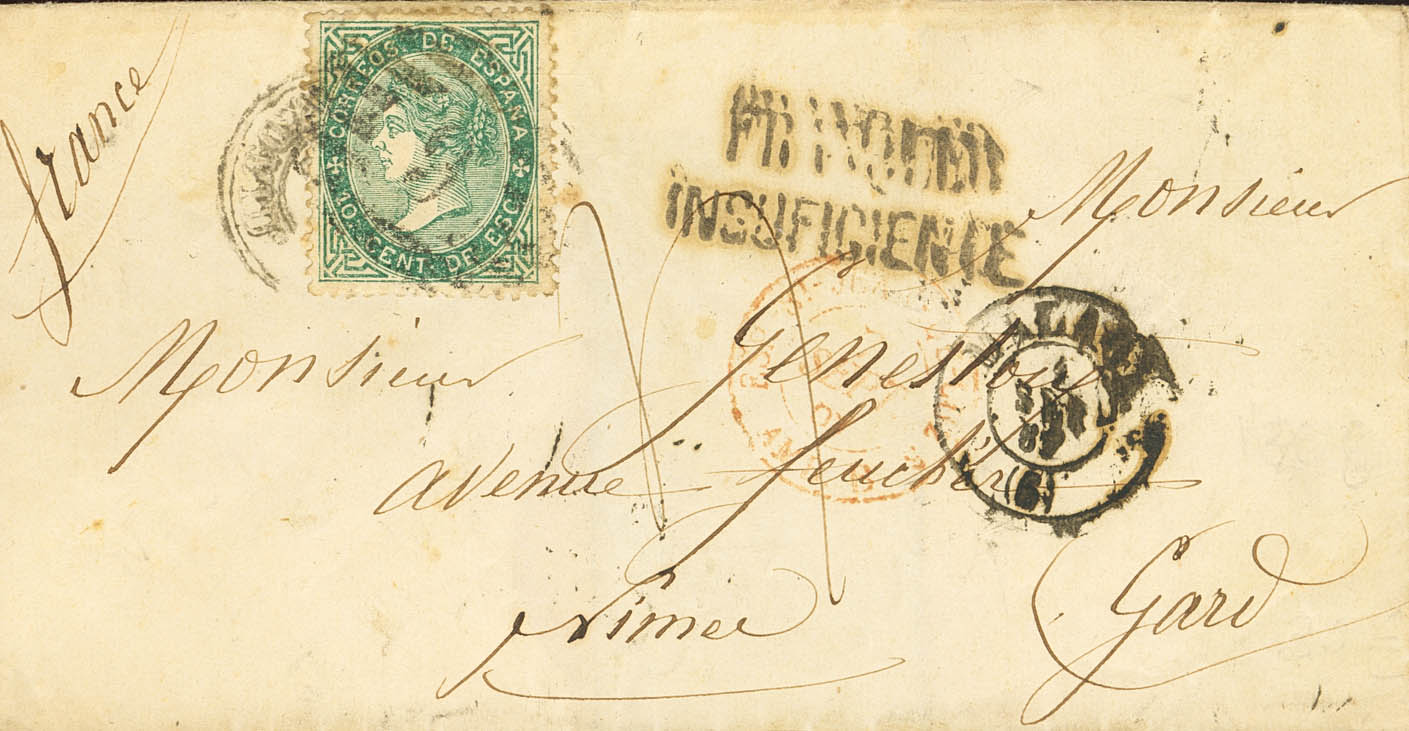 91. 1867. 10 cts verde. MALAGA a NIMES (FRANCIA). En el frente FRANQUEO INSUFICIENTE. MAGNIFICA Y RARA A FALTA DE 3´5 CUARTOS.