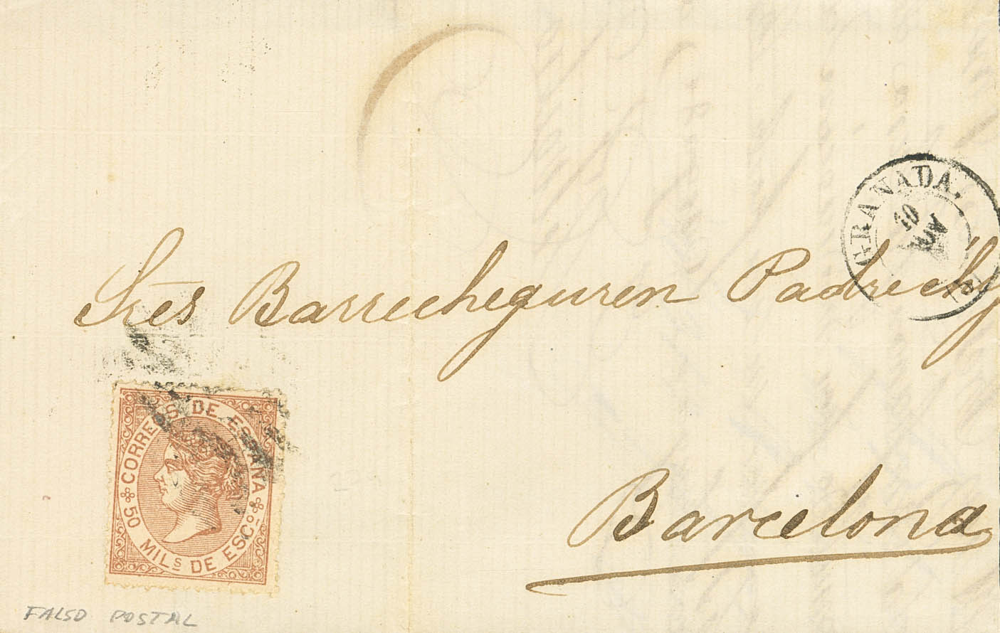 96F. 1868. 50 mils castaño claro FALSO POSTAL TIPO III. GRANADA a BARCELONA. MAGNIFICA Y RARA.