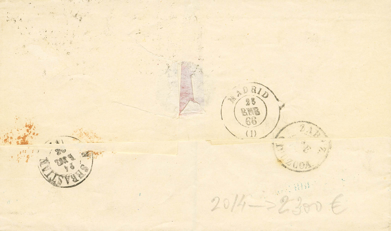 96. 1868. 50 mils castaño claro y sello de Francia de 40 cts naranja. PARIS a ZARAUTZ y reexpedida a MADRID. MAGNIFICO Y RARISIMO FRANQUEO MIXTO, DEBIDO A LA REEXPEDICION Y SU CORRESPONDIENTE REFRANQUEO DESDE ZARAUTZ A MADRID, SIN DUDA UNA DE LAS PIEZAS MAS ESPECTACULARES DE LA EMISION.