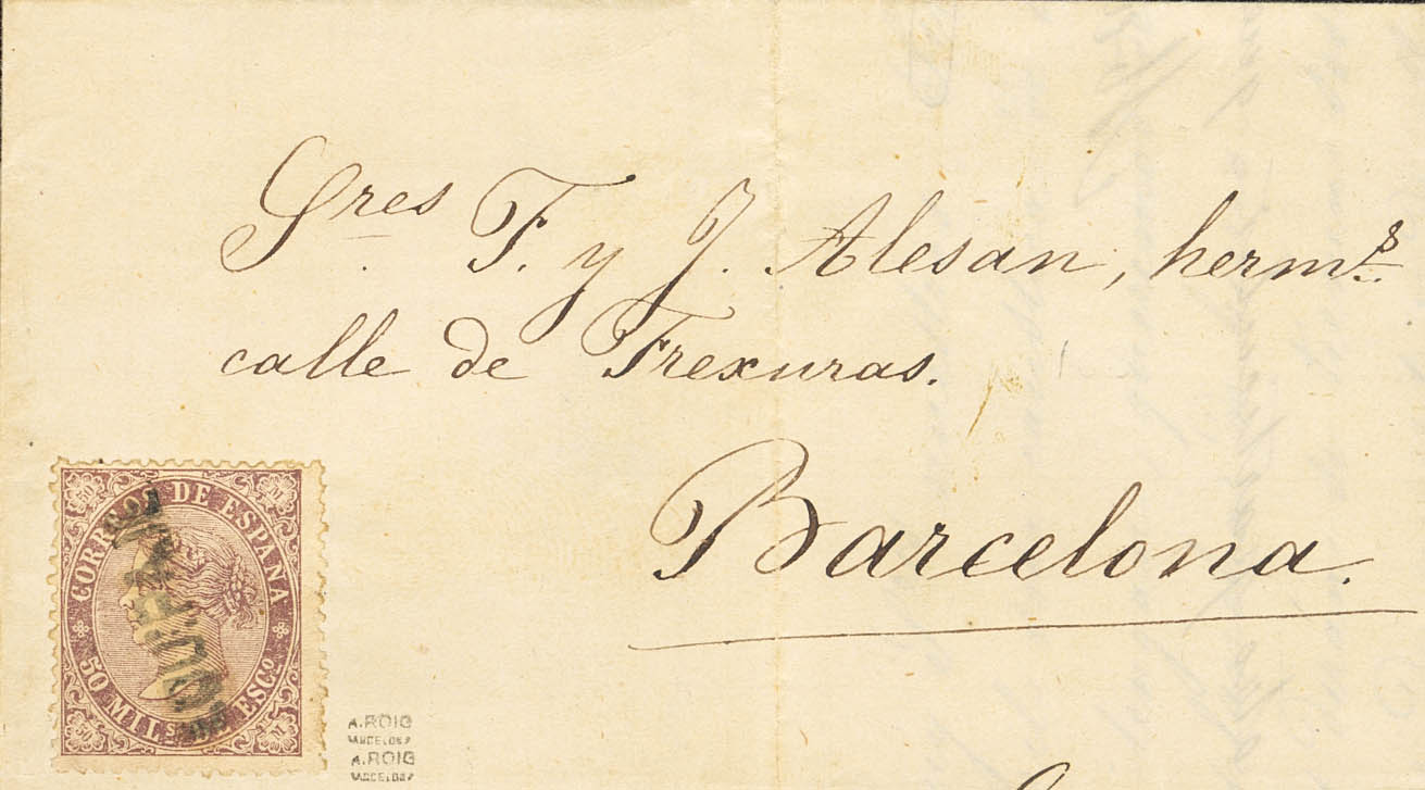 98. 1869. 50 mils violeta. GRANOLLERS (BARCELONA) a BARCELONA. Matasello EQUIPAJE, en negro de Granollers. MAGNIFICA Y MUY RARO.