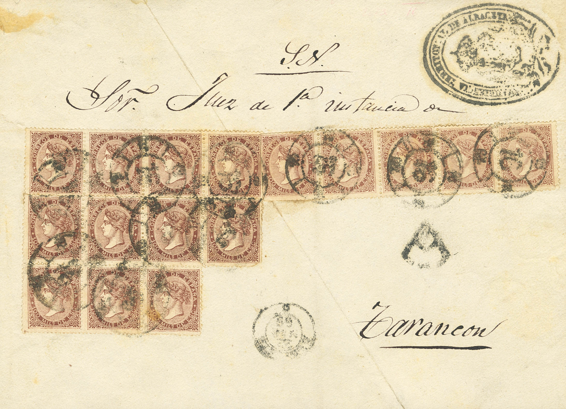 99(16). 1868. 100 mils castaño, bloque de dieciséis. Frente de Plica Judicial de ALBACETE a TARANCON (CUENCA). Matasello R.CARRETA Nº16, de Albacete, en el frente marca AUDIENCIA TERRITORIAL DE ALBACETE y marca "A" de abono. MAGNIFICA Y EXTRAORDINARIAMENTE RARA, FRANQUEO EXCEPCIONAL Y CASI CON TODA SEGURIDAD SE TRATA DEL MAYOR FRANQUEO CONOCIDO CON EL 100 MILS.