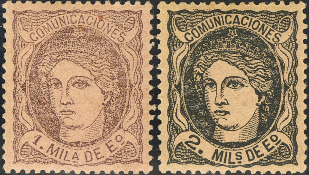 ★ 102, 103. 1870. 1 mils violeta y 2 mils negro. Color y centraje excepcional. MAGNIFICOS.