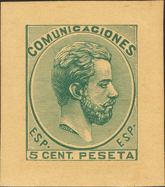 (★) 129P. 1872. 5 cts verde. PRUEBA DE PUNZON, de un DISEÑO NO ADOPTADO PARA ESTE VALOR. MAGNIFICA Y RARA. (Gálvez 765)