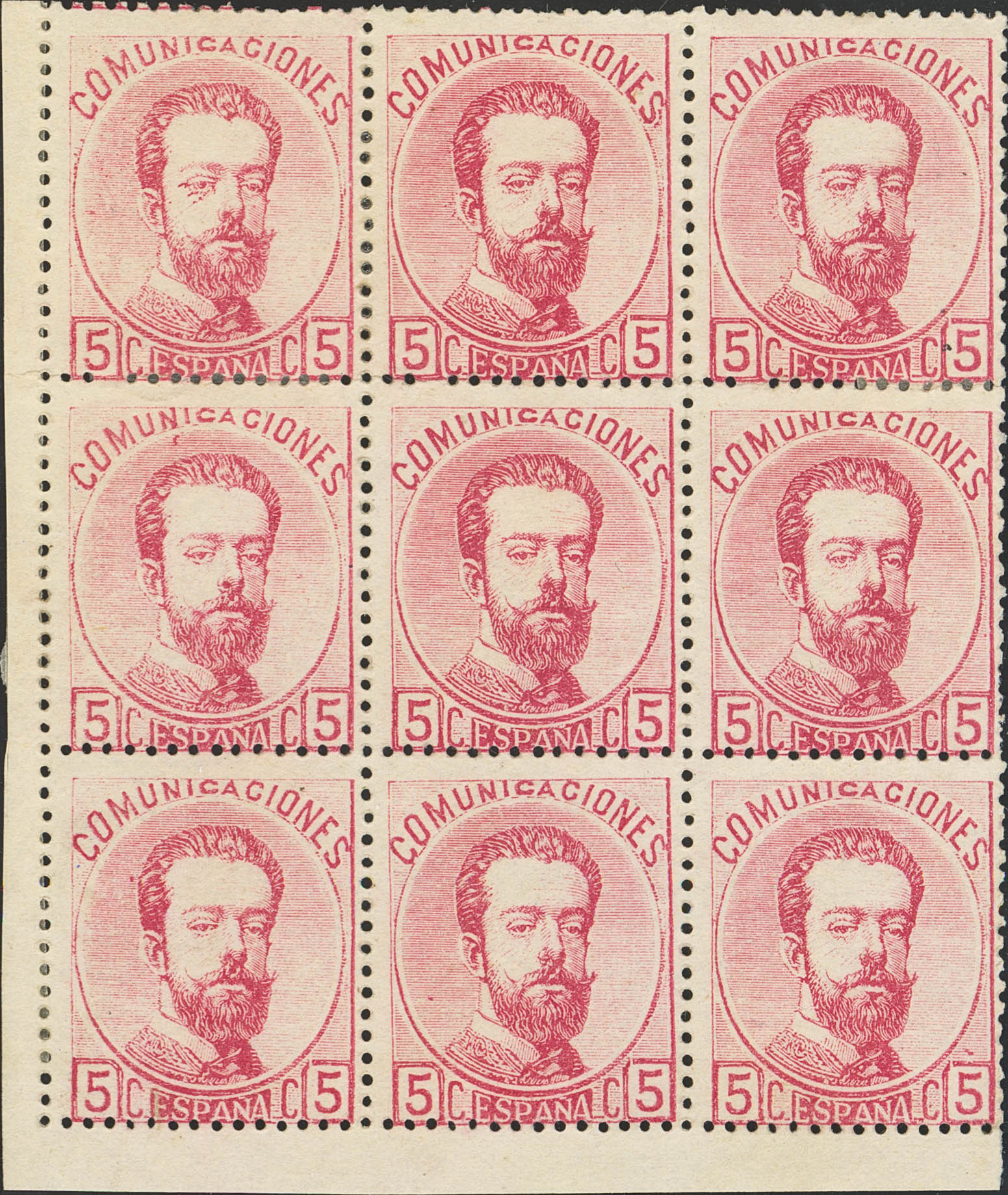 (★) 118(9). 1872. 5 cts rosa, bloque de nueve y esquina de pliego. MAGNIFICO Y MUY RARO, VERDADERAMENTE ESPECTACULAR. Edifil 2020: +++355 Euros