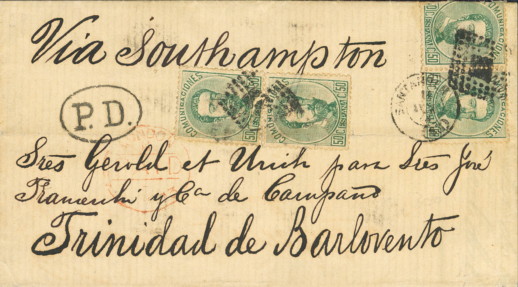 126(4). 1873. 50 cts verde, cuatro sellos (un sello parcialmente adherido al dorso). SANTANDER a TRINIDAD DE BARLOVENTO (CUBA). Circulada a través del encaminador GERALD Y ULRICH, tarifa de doble porte vía Inglaterra en vigor desde Enero de 1873. MAGNIFICA Y ESPECTACULAR Y RARO FRANQUEO.
