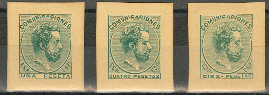 (★) 127/29P. 1872. PRUEBAS DE PUNZON del 1 pts, 4 pts y 10 pts, en verde. MAGNIFICAS Y RARAS. (Gálvez 761/63)