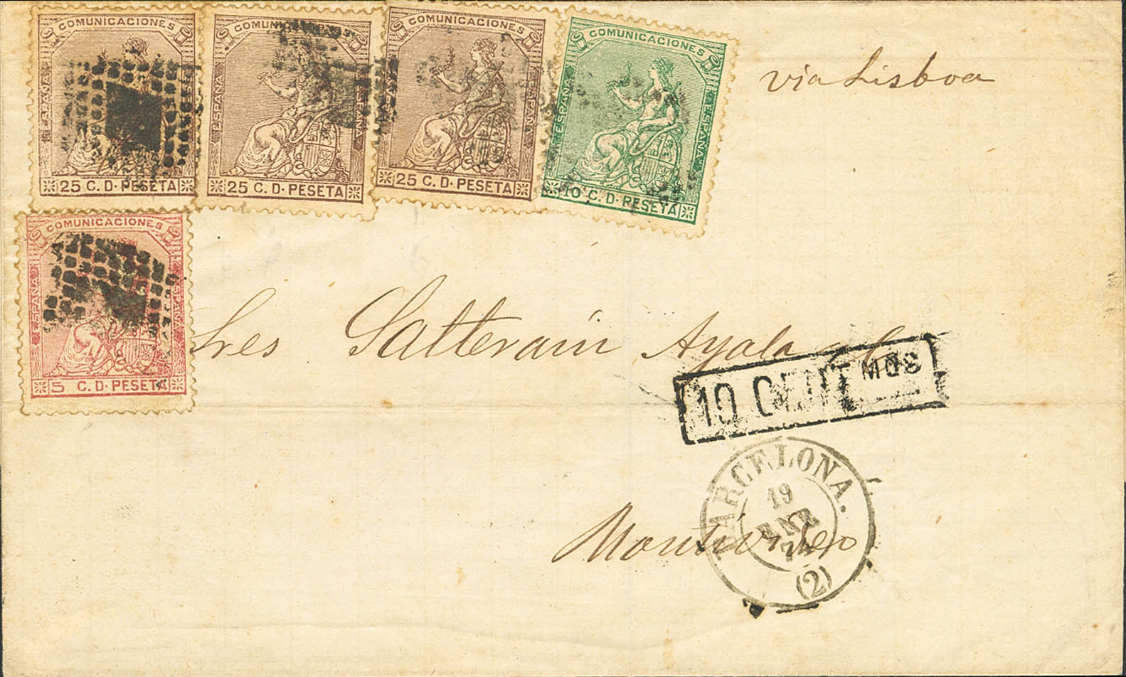 132, 133, 135(3). 1874. 5 cts rosa, 10 cts verde y 25 cts castaño, tres sellos. BARCELONA a MONTEVIDEO (URUGUAY). En el frente marca de tasa 10 CENTMOS (centésimos), aplicada en destino y manuscrito "Vía Lisboa". MAGNIFICA Y RARISIMA COMBINACION DE FRANQUEO PARA COMPLETAR LA VIEJA TARIFA DE AGOSTO DE 1867 POR LA VIA DE PORTUGAL (EXISTE OTRA TARIFA DE ABRIL DE 1872 POR EL MISMO IMPORTE PERO POR BUQUES INGLESES).