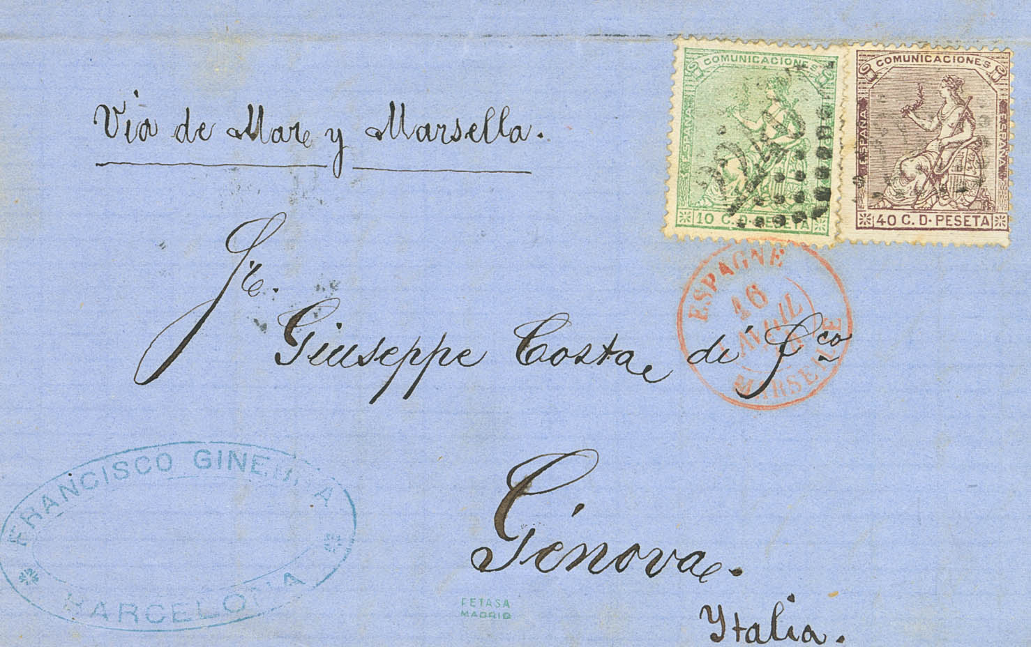 133, 136. 1874. 10 cts verde y 40 cts castaño. BARCELONA a GENOVA. Matasello francés ROMBO DE PUNTOS Nº2240, aplicado a la llegada. MAGNIFICA Y RARA. Cert. GRAUS.