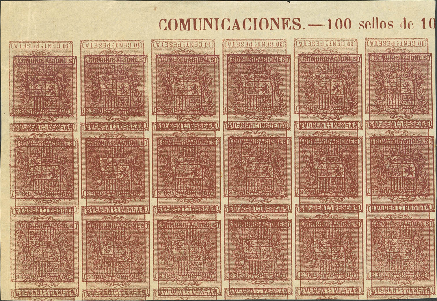 (★) 153M(18). 1874. 10 cts castaño, bloque de dieciocho. MACULATURA. MAGNIFICA Y ESPECTACULAR, EN UN BLOQUE TAN GRANDE.