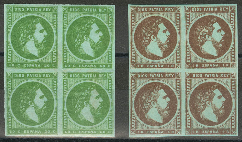 ★★/★ 160/61p. 1875. Serie completa, bloque de cuatro. PAPEL AZULADO. MAGNIFICOS Y RAROS. Edifil 2020: ++608 Euros