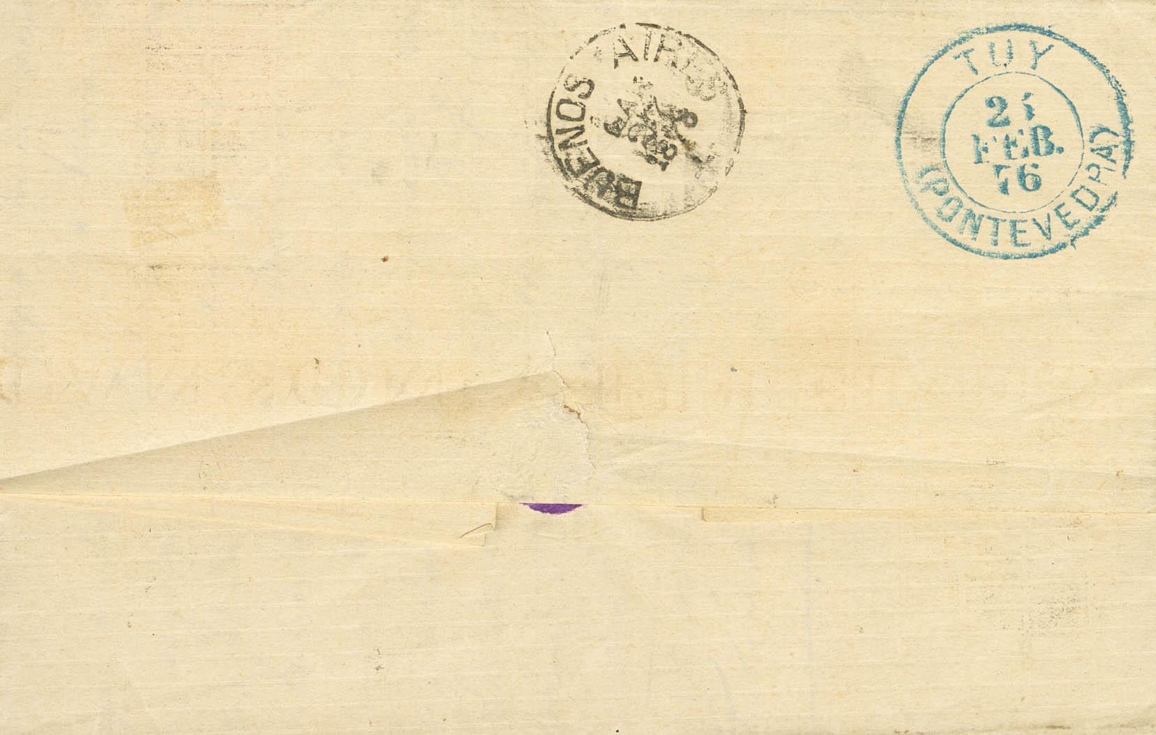 164(2), 168, 154. 1876. 10 cts azul, dos sellos, 50 cts lila y 5 cts verde. LA CORUÑA a BUENOS AIRES (ARGENTINA). MAGNIFICA Y RARA COMBINACION DE FRANQUEO PARA COMPLETAR LA TARIFA DE 75 CTS VIA PORTUGAL, ESPECIALMENTE CON UN SELLO DE IMPUESTO DE GUERRA SUSTITUYENDO A UN SELLO POSTAL.