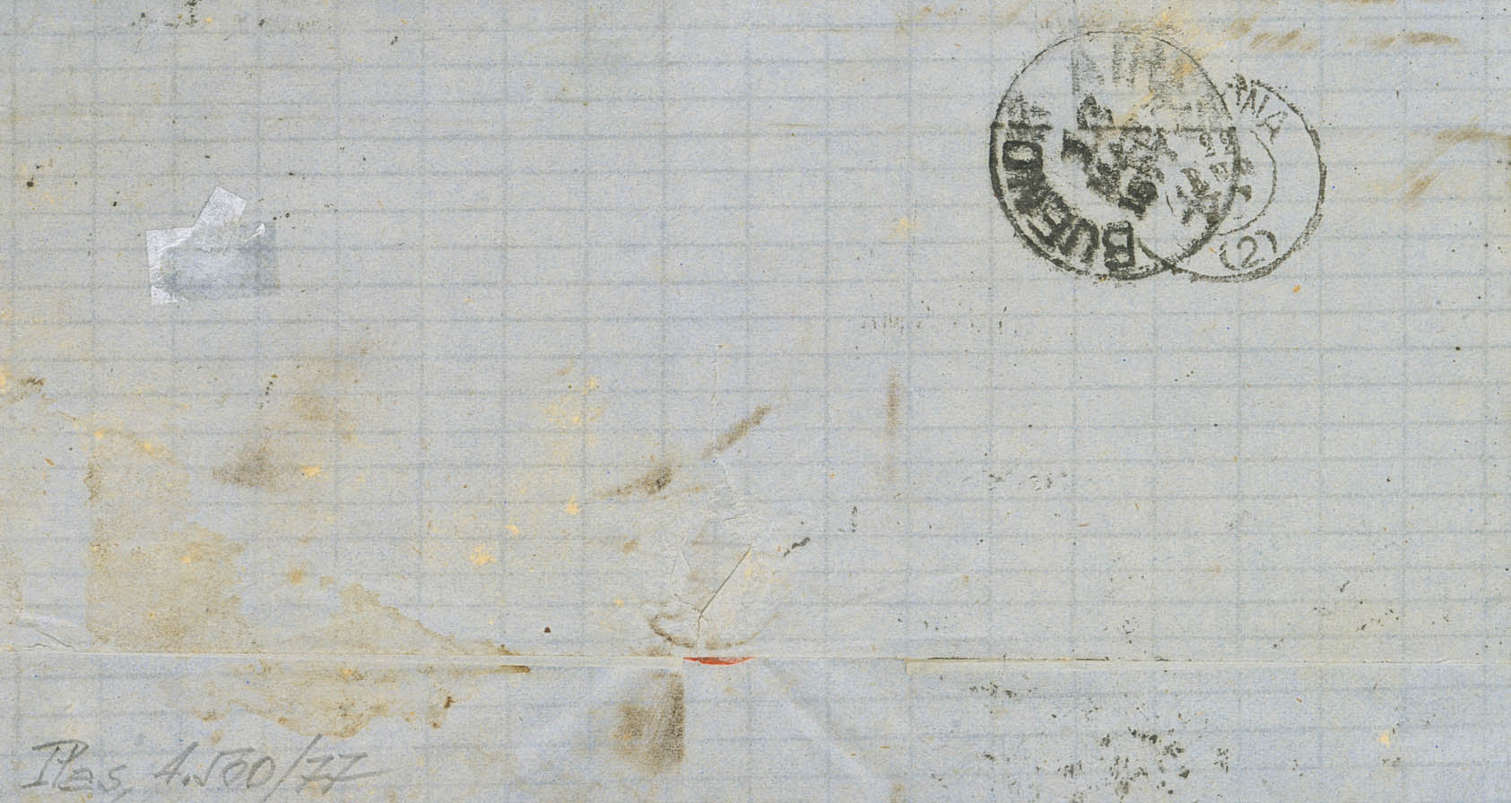 174, 175, 179. 1877. 5 cts castaño, 10 cts azul y 50 cts verde. BARCELONA a BUENOS AIRES (ARGENTINA). En el frente manuscrito "Por vapor Poitou", franqueo de 65 cts según tarifa de Enero de 1876. MAGNIFICA Y RARA.