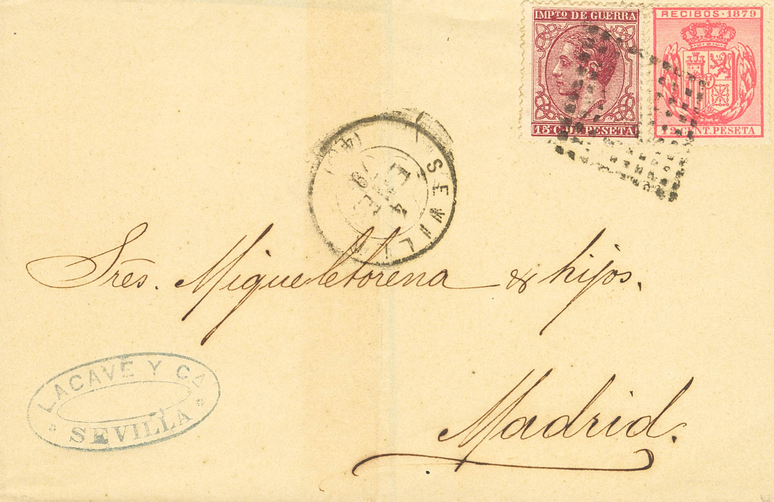 188. 1879. 12 cts rosa RECIBOS (1879) y 15 cts carmín de Impuesto de Guerra. SEVILLA a MADRID. Matasello ROMBO DE PUNTOS. MAGNIFICA Y RARO USO POSTAL DE UN SELLO FISCAL.