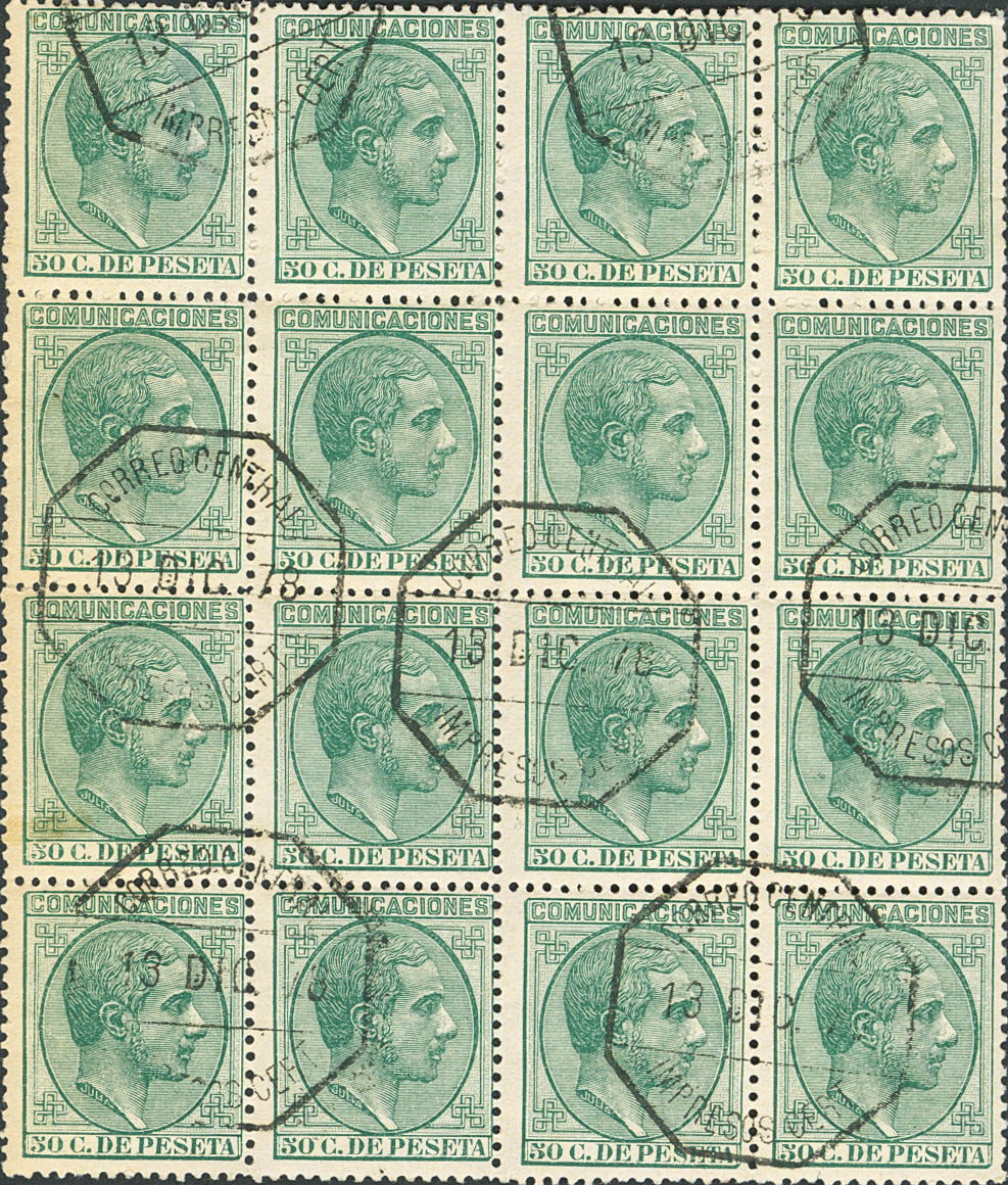 196(16). 1878. 50 cts verde, bloque de dieciséis (dos sellos adelgazados). BONITO.