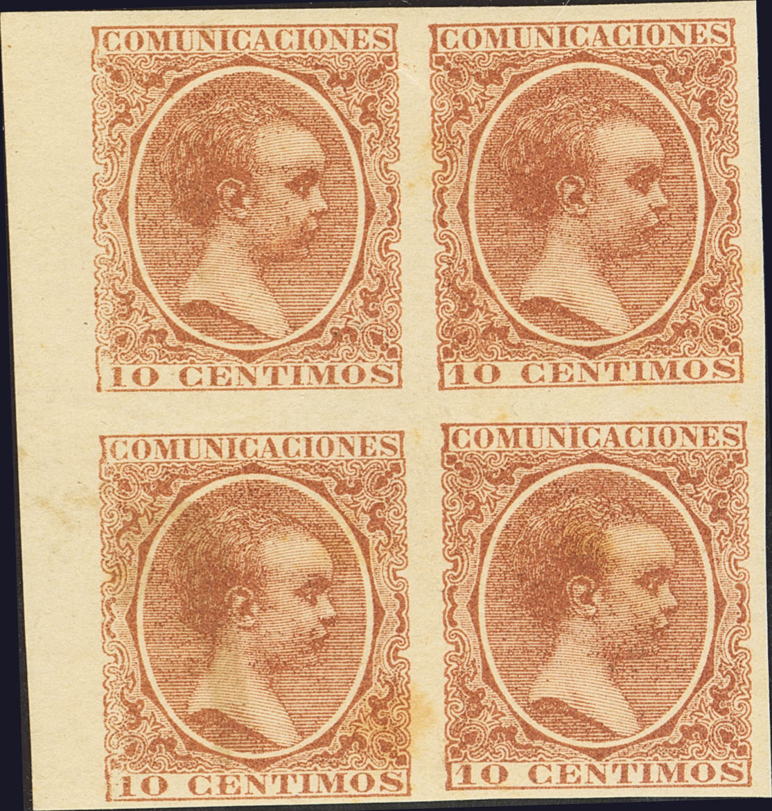 ★★ 217s(4). 1889. 10 cts castaño, bloque de cuatro. SIN DENTAR. MAGNIFICO Y RARO. Edifil 2026: 240 Euros