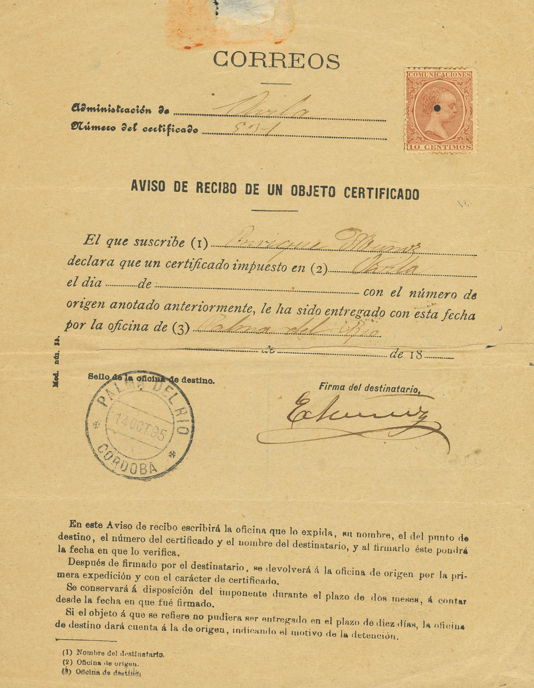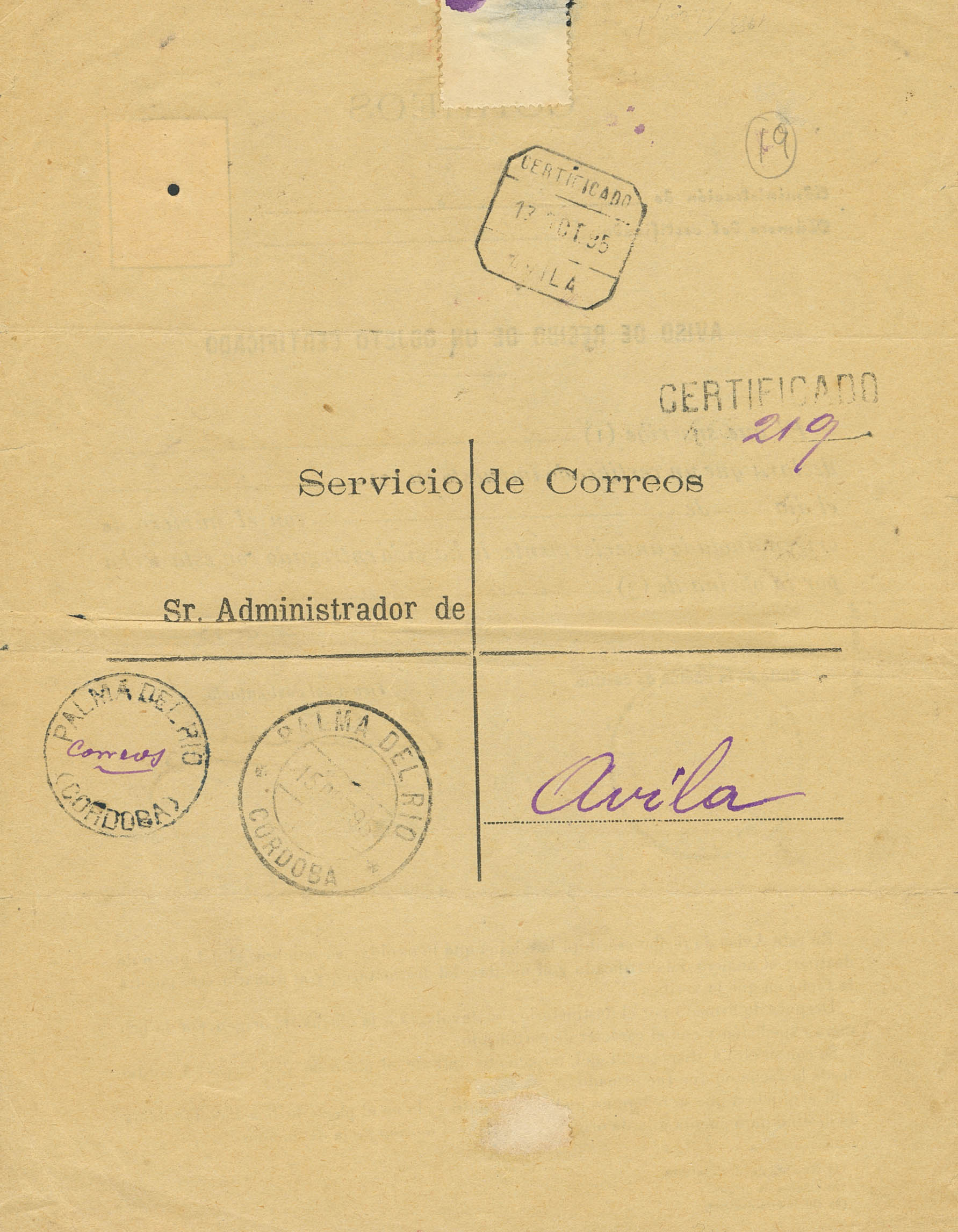 217. 1895. 10 cts castaño sobre AVISO DE RECIBO de PALMA DEL RIO a AVILA. MAGNIFICO.