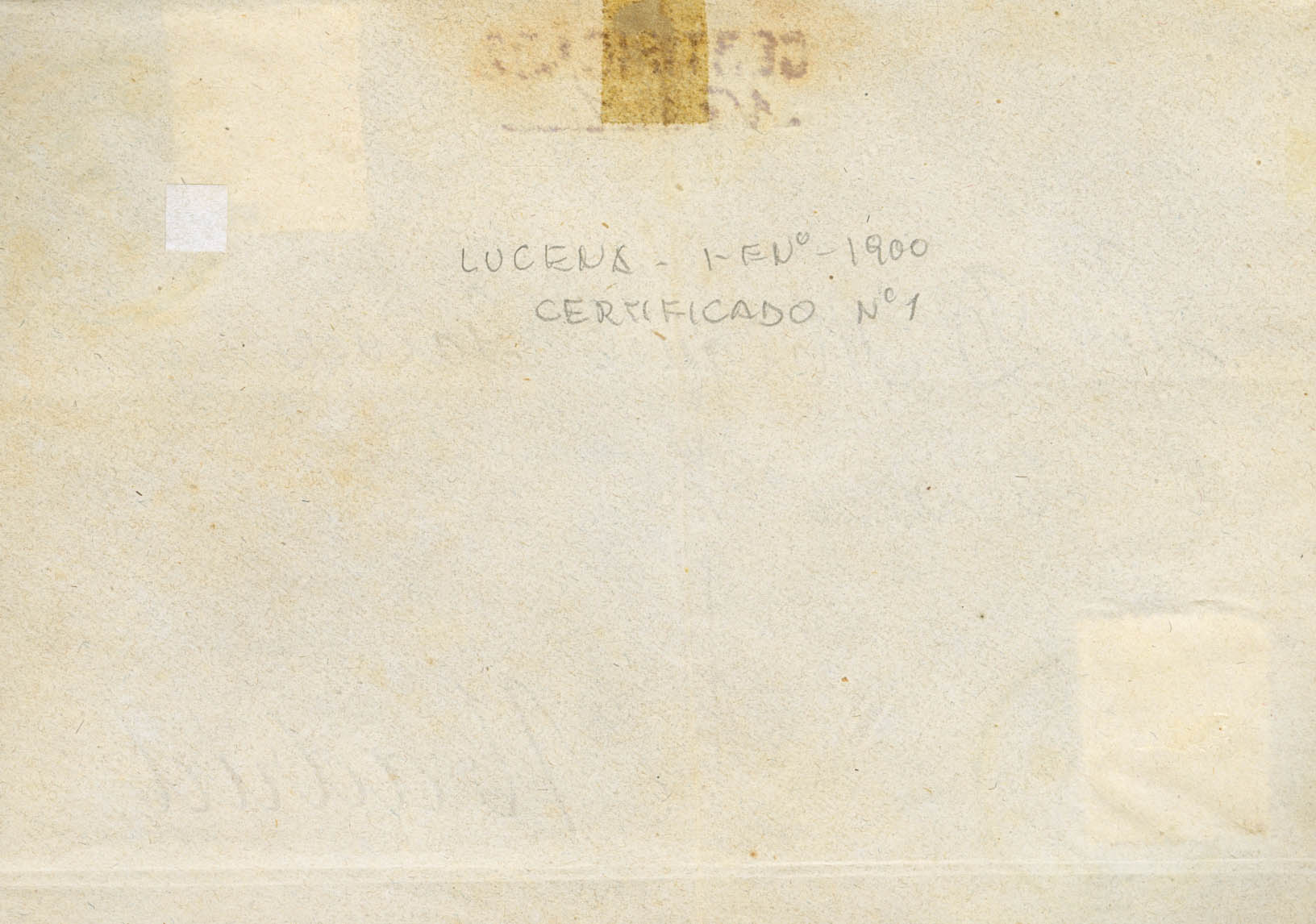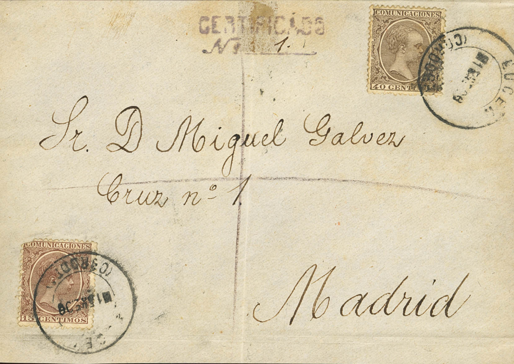 219(2). 1900. 15 cts castaño lila, dos sellos. Frontal de Certificado de LUCENA (CORDOBA) a MADRID. Matasello LUCENA / (CORDOBA). MAGNIFICO Y RARO, CIRCULADO EL PRIMER DIA DEL SIGLO XX.